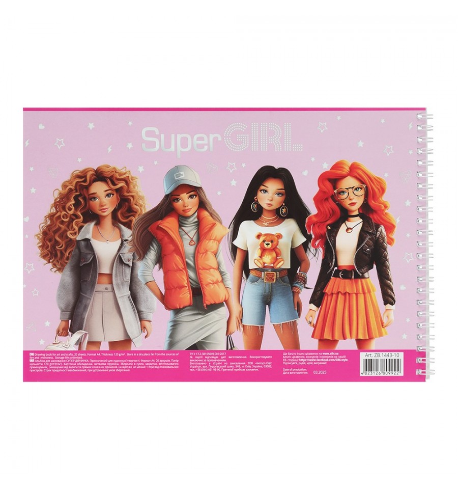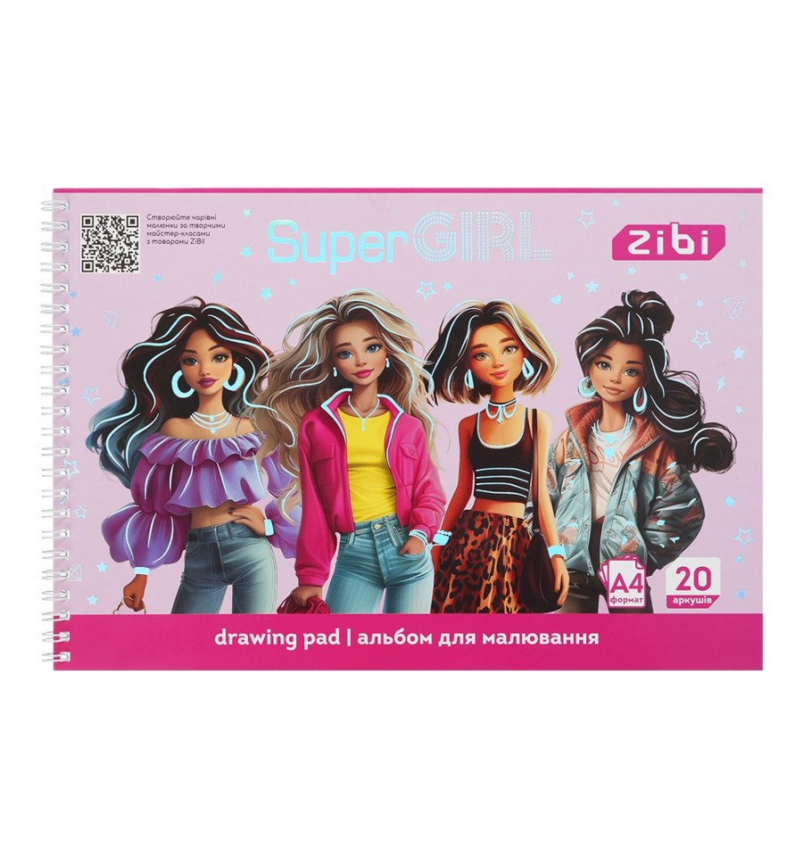 Альбом для рисования Super Girl от ZiBi – незаменимый атрибут для рисования, который пригодится всем школьникам, дошкольникам и не только. Благодаря сбалансированному и тщательно подобранному соотношению плотности и рыхлости бумаги альбом подходит для рисования карандашами и красками. Яркий стильный дизайн обложки. Многие другие канцтовари из этой серии помогут собрать стильную неповторимую коллекцию.формат А4 20 листов тип крепления: металлическая пружина белого цвета – листы пролистываются идеально ровно и легко, ничего не заминается. внутренний блок: бумага белого цвета плотностью 120 г/м² обложка: мелованный картон плотностью 200 г/м² с дизайнерским рисунком и полиграфическими эффектами: выборочное тиснение серебряной голографической фольгой и УФ лак QR-код со ссылкой на страницу ZiBi, где размещено множество мастер-классов по рисованию, на каждом альбоме групповая упаковка: 4 шт. одного дизайна