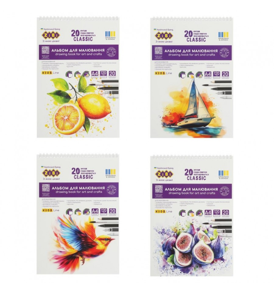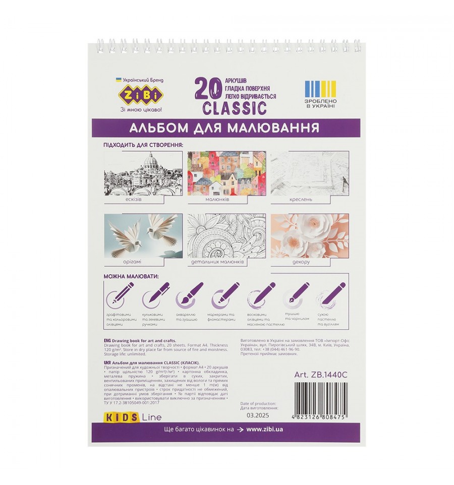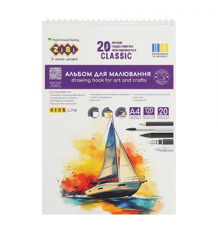 Альбом для рисования серии CLASSIC от ZiBi – для рисования графитовыми, цветными и восковыми карандашами, акварельными и гуашевыми красками, сухой, масляной пастелью, углем, тушью, чернилами, шариковыми и гелевыми ручками, скетч-маркерами. Может использоваться для создания эскизов, рисунков, чертежей, оригами, декора и других видов творчества. Может использоваться детьми и взрослыми в области обучения, хобби, творчества и декоративного оформления. • гладкая поверхность листов • листы легко отрываются • обложка – полноцветная, картонная • QR-код на обложке с переходом на мастер-классы по рисованию от ZiBi • количество дизайнов обложки – 4Технические характеристики • формат – А4 (вертикальное расположение) • плотность бумаги, г/м² – 120 • тип скрепления – пружина (по короткой стороне) • количество листов – 20 • цвет листов – белый • плотность обложки – 200 г/м²Состав Бумага, картон, металлическая пружина