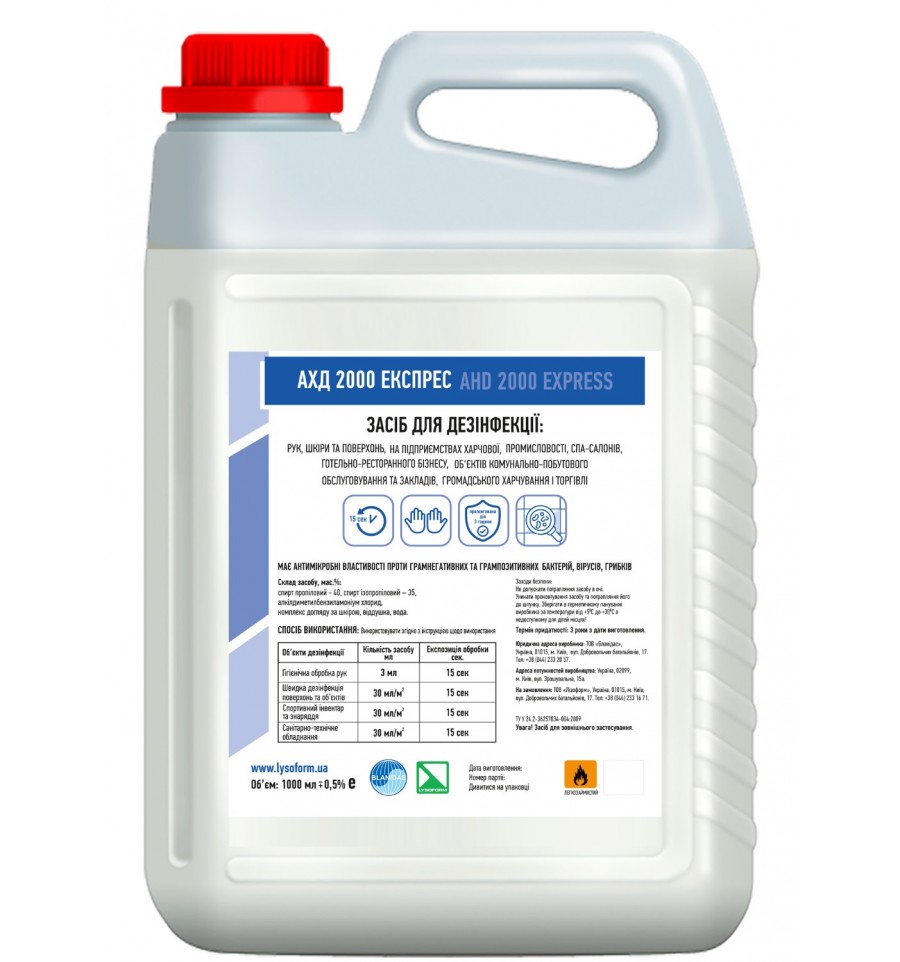 АХД 2000 Экспресс – быстродействующее дезинфицирующее средство для антисептической гигиенической и хирургической обработки рук и кожи и во всех зонах, где необходимо проводить гигиеническую антисептическую обработку рук и кожи. А также для быстрой дезинфекции небольших поверхностей, изделий медицинского назначения, в частности инструментов, перчаток и других небольших по размеру предметов. Рекомендован для применения в ЛПЗ, в детских школьных и дошкольных учреждениях, пищевых производствах, на предприятиях общественного питания; на химико-фармацевтических, биотехнологических и парфюмерно-косметических предприятиях, в учреждениях социального обеспечения (дома престарелых, инвалидов и др.), на объектах коммунальных служб (в том числе в парикмахерских и косметических салонах), а также для населения в быту. Рекомендован также для дезинфекции локтевых сгибов доноров, обработки кожи операционного, инъекционного поля, обработки кожи во время инвазионных методов диагностики и лечения пациентов. Время действия: Гигиеническая обработка: 3 мл - 15 сек. Хирургическая обработка: 5-10 мл - 1 мин. Антисептическая обработка кожи пациента: от 15 с до 10 мин. Быстрая дезинфекция - 15 с