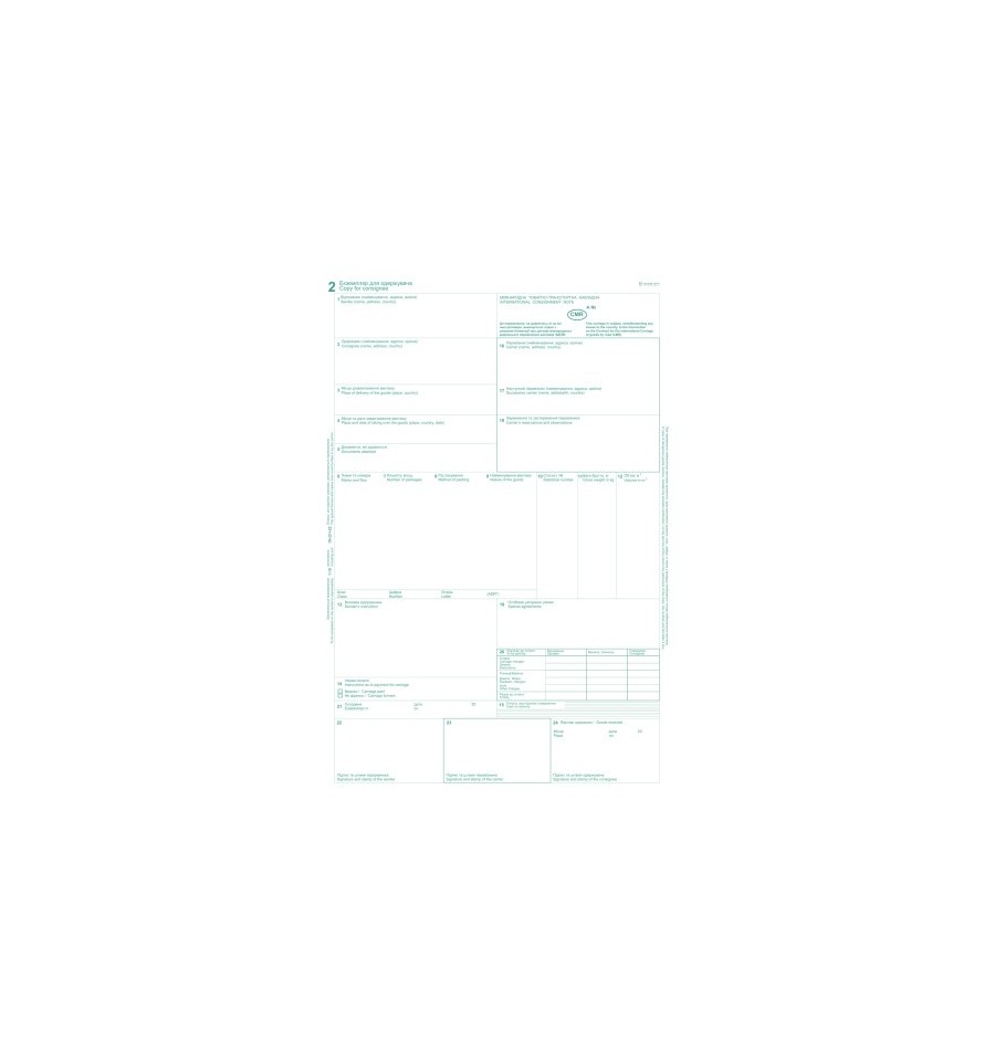 Международная товарно-транспортная накладная - это бланк изготовлен на самокопировальной бумаге, комплект из девяти листов, которые имеют одну и ту же информацию, но различаются по цвету. 1 лист - голубой, 2 лист - зеленый, 3 лист - розовый, другие- черного цвета. В правом верхнем углу пробивная нумерация, дублируется на всех листах. Клиентом заполняется 1 лист и вся информация дублируется в комплекте. С нумерацией листов