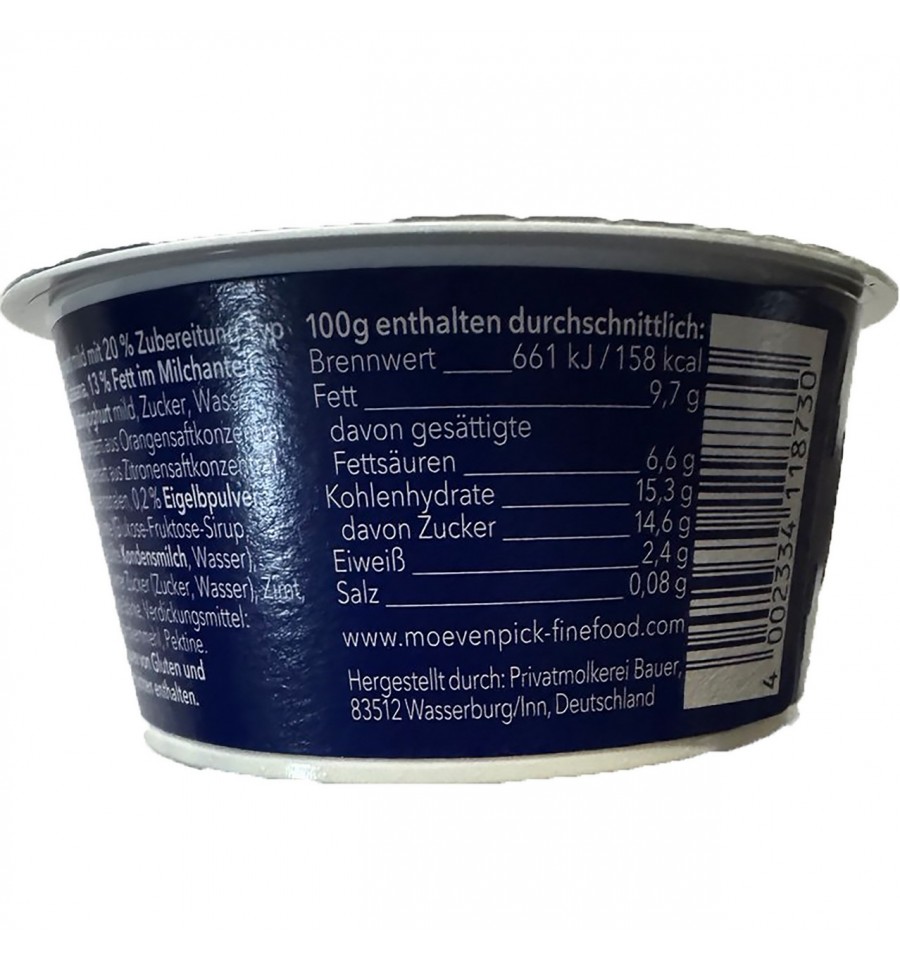 Йогурт Movenpick Winter edition крем каталана 13% 150г. Йогурт Movenpick Creme Catalana сочетает нежность с карамельными нотками классического каталонского крема. Благодаря высокому содержанию жира (13%) обладает бархатной текстурой и насыщенным вкусом, который создает ощущение настоящего праздника. Состав: йогурт сливочный мягкий, сахар, вода, 5,2% апельсиновый сок из концентрата апельсинового сока, 1,3% лимонный сок из концентрата лимонного сока, 0,3% лимонные шкурки, 0,2% порошок желтка, карамельный крем из глюкозо сахаром, вода), карамелизированный сахар (сахар, вода), корица, модифицированный крахмал, загустители: камедь рожкового дерева, пектины. Аллергены: Может содержать следы глютена и орехов Энергетическая ценность на 100г продукта: 661 кДж/158ккал, жиры - 9,7 г, насыщенные жиры - 6,6 г, углеводы - 15,3 г, сахара - 14,6 г, термин, 0,8, г, 0,8, г, 0,8 г, бел. годности: 35 суток. Хранить при температуре от +2°С до +8°C. Изготовлено в Германии для компании Movenpick: Privatmolkerei Bauer83512 Wasserburg/Inn, Deutschland. Адрес производственных мощностей: 83512 Wasserburg/Inn, Deutschland. Страна: Германия. Масса нетто: 150 г