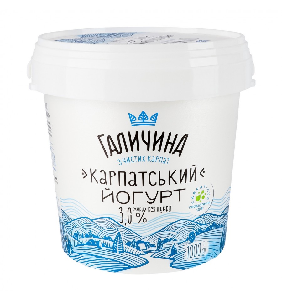 Йогурт Галичина Карпатский без сахара 3% 1000г. Состав: молоко коровье цельное, молоко обезжиренное, белок молочный, йогуртная закваска (streptococcus thermophiles, lactobacillus delbrueckii подвид bulgaricus), закваска Carpaticus. Энергетическая ценность продукта: 244кДж/100г, 58ккал/100г. Питательная (пищевая) ценность продукта: белки – 4.1г/100г, жиры – 3г/100г, насыщенные жиры – 1.9г/100г, углеводы – 3.7г/100г, из них сахара – 3.7г/100г, соль – 0.1. Массовая доля жира: 3%. Условия хранения: хранить при температуре +4 (+/-2)ºC. Срок годности: 21 день. Страна изготовитель: Украина. Производственные мощности и адрес производственных мощностей: ЧАО Галичина, ул. Б. Хмельницкого, 120, г. Радехов, Червоноградский р-н, Львовская обл., Украина, 80200. Масса нетто: 1000г.