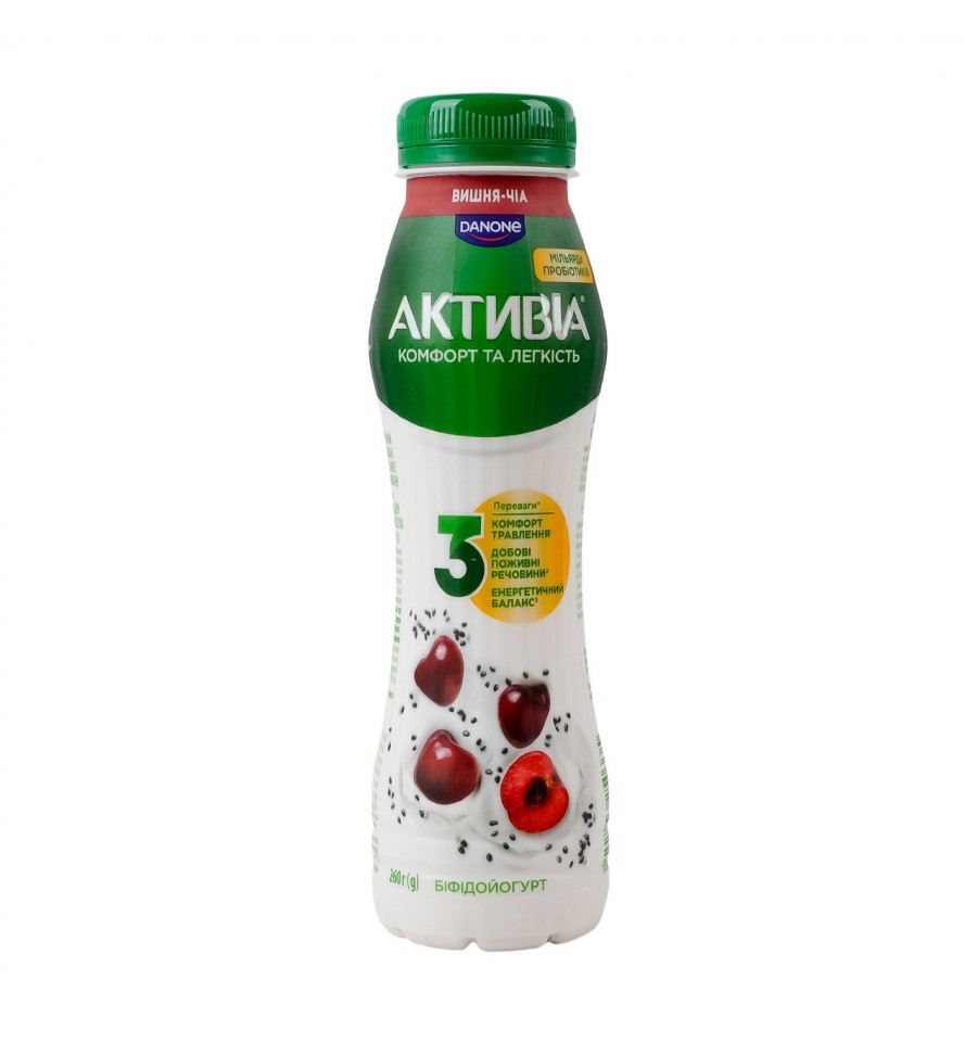 Бифидойогурт Активиа Вишня-чиа питьевой с бифидобактериями Actiregularis 1.2% 260г. Состав: молоко нормализованное, наполнитель Вишня-чиа 8% (сахар, вода питьевая, вишня 30%, загустители: крахмал, пектины, семена чиа 2.5%, ароматизатор черешни, цитрат кальция, регуляторы кислотности: цитрат натрия, кислота лимонная, концентрированный, сок черный загуститель крахмал, закваски бактериальные, пробиотик ActiRegularis. Без ГМО. Энергетическая ценность продукта: 288кДж/100г, 69ккал/100г. Питательная (пищевая) ценность продукта: белки – 3.1г/100г, жиры – 1.3г/100г, насыщенные жиры – 0.8г/100г, углеводы – 11.2г/100г, из них сахара – 11г/100г, соль – 0. Массовая доля жира: 1,2%. Минерализация: кальций (Ca) – 120мг/100г. Рекомендуемый способ приготовления/употребления: рекомендуется перед употреблением взболтать. Условия хранения: хранить при температуре +4 (+/-2)ºC. Срок годности: 27 дней. Страна изготовитель: Украина. Производитель и адрес производителя: ЧАО Данон Кремез, ул. Врача О. Богаевского, 14/69, г. Кременчуг, Полтавская обл., Украина, 39600. Масса нетто: 260г.