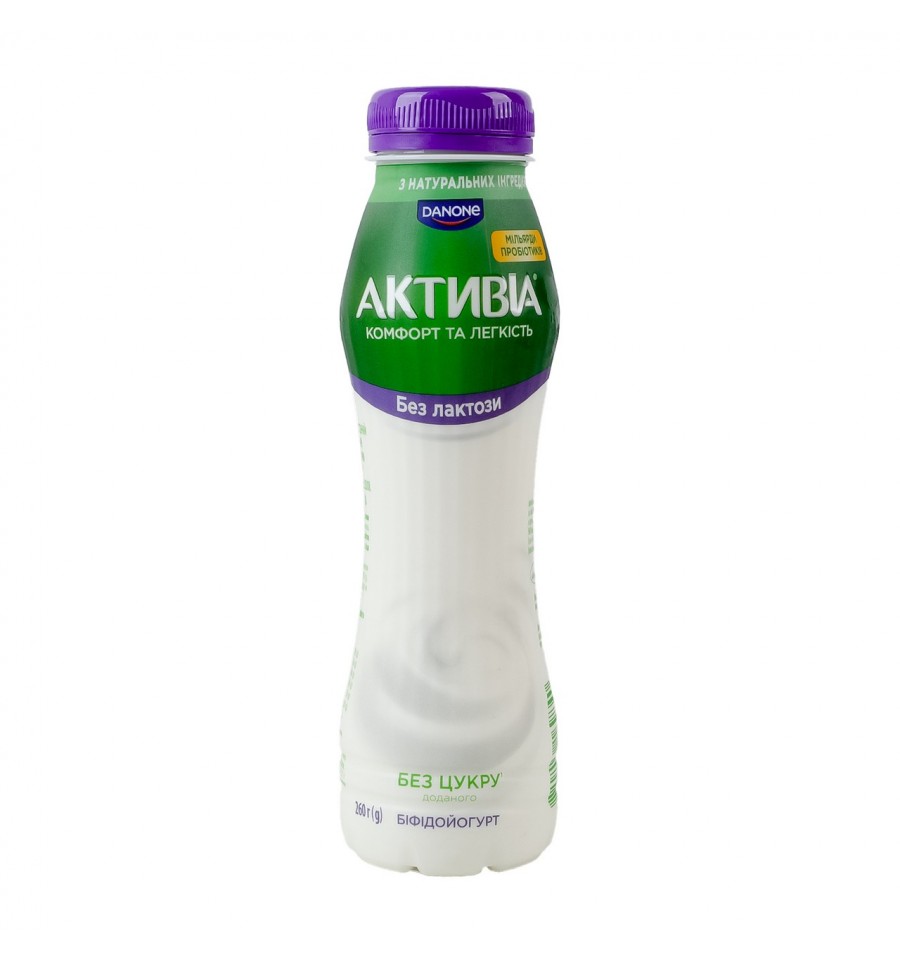Бифидойогурт Активиа безлактозный без добавленного сахара с бифидобактериями Actiregularis 0.9% 260г. Состав: молоко нормализованное, молоко сухое обезжиренное, энзим пищевой лактаза, закваски бактериальные, пробиотик ActiRegularis. Без ГМО. Энергетическая ценность продукта: 171кДж/100г, 41ккал/100г. Питательная (пищевая) ценность продукта: белки – 3.4г/100г, жиры – 0.9г/100г, насыщенные жиры – 0.6г/100г, углеводы – 4.8г/100г, из них сахара – 4.8г/100г, соль – 0. Массовая доля жира: 0,9%. Рекомендуемый способ приготовления/употребления: рекомендуется перед употреблением взболтать. Условия хранения: хранить при температуре +4 (+/-2)ºC. Срок годности: 1 месяц. Страна изготовитель: Украина. Производитель и адрес производителя: ЧАО Данон Кремез, ул. Врача О. Богаевского, 14/69, г. Кременчуг, Полтавская обл., Украина, 39600. Масса нетто: 260г.