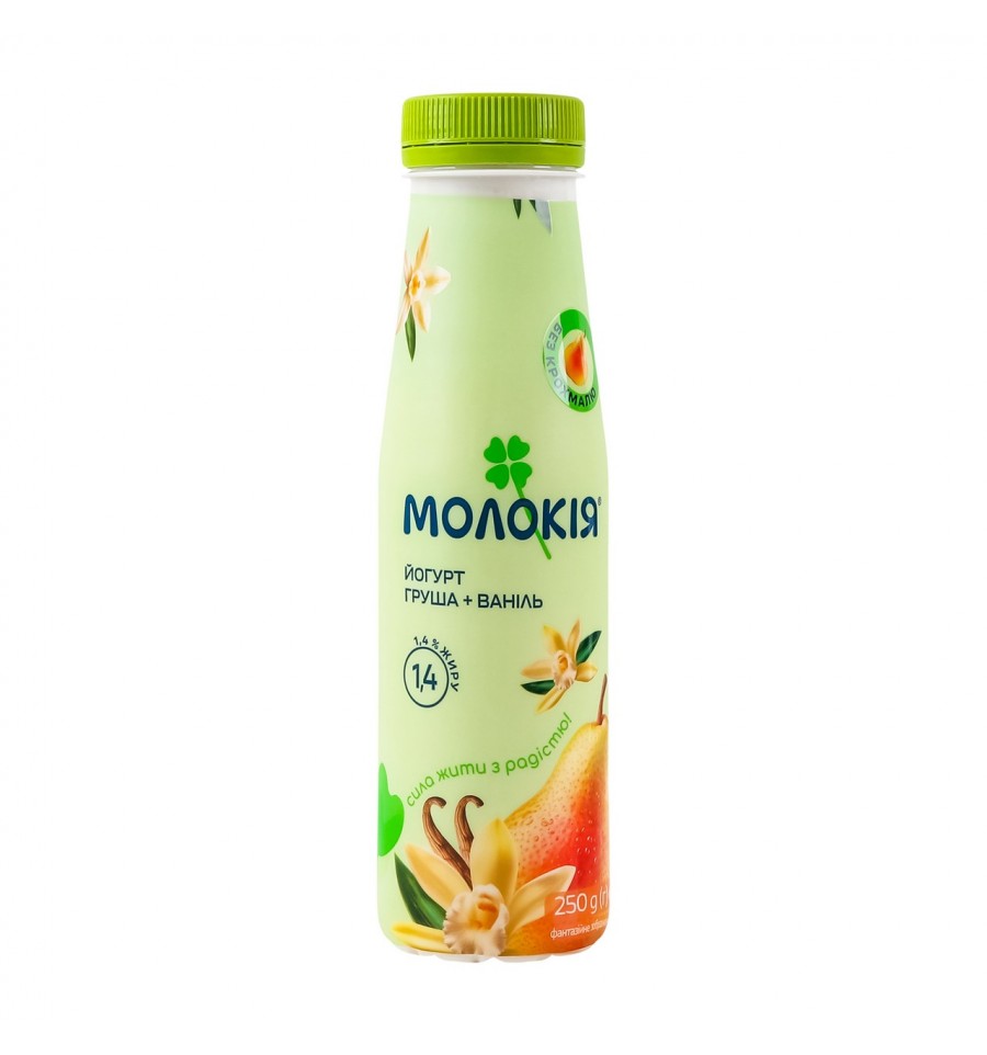 Йогурт Молокия Груша-ваниль питьевой 1.4% 250г. Состав: молоко коровье нормализованное - 90%, наполнитель фруктовый пастеризованный Груша-ваниль - 7.5% (сахар, груша - 25%, вода питьевая, пюре грушевое - 5%, натуральный ароматизатор Ваниль, загустители - пектины Е440, сок лимонный концентр молочный, натуральный экстракт ванили), сахар – 2.5%, закваска для йогурта (Streptococcus thermophilus, Lactobacillus delbrueckii подвид bulgaricus). Энергетическая ценность продукта: 276кДж/100г, 65ккал/100г. Питательная (пищевая) ценность продукта: белки – 2.6г/100г, жиры – 1.4г/100г, насыщенные жиры – 0.8г/100г, углеводы – 10.6г/100г, из них сахара – 10.6г/100г, соль – 1.0г/100г. Массовая доля жира: 1,4%. Рекомендуемый способ приготовления/употребления: перед употреблением взболтать. Условия хранения: хранить при температуре +2...+6ºC. Срок годности: 21 день. Срок годности после открытия продукта: 24 часа. Страна изготовитель: Украина. Производственные мощности и адрес производственных мощностей: ЧАО Тернопольский молокозавод, ул. Лозовецкая, 28, г. Тернополь, Украина, 46010. Масса нетто: 250г.