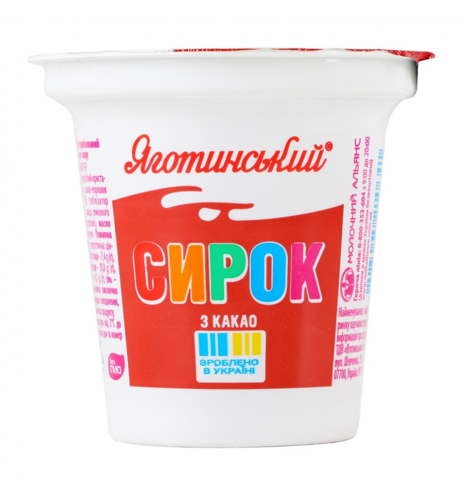 Сырок Яготинский сладкий термизированный из какао 7.4% 100г. Состав: творог кисломолочный, сахар белый кристаллический, сыворотка молочная, какао-порошок алкализованный (20-22%) - 2%, стабилизатор (желатин, ксантановая камедь, камедь рожкового дерева, стандартизированный декстрозой), масло сливочное, ароматизатор Фундук. Без ГМО. Энергетическая ценность продукта: 867кДж/100г, 206ккал/100г. Питательная (пищевая) ценность продукта: белки – 14.1г/100г, жиры – 7.4г/100г, насыщенные жиры – 5.2г/100г, углеводы – 20.8г/100г, из них сахара – 20.4г/100г, соль. Массовая доля жира: 7,4%. Условия хранения: хранить при температуре +2...+6ºC. Срок годности: 19 дней. Страна изготовитель: Украина. Оператор рынка и адрес оператора рынка: ОДО Яготинский маслозавод, ул. Шевченко, 213, г. Яготин, Киевская обл., Украина, 07700. Масса нетто: 100г.