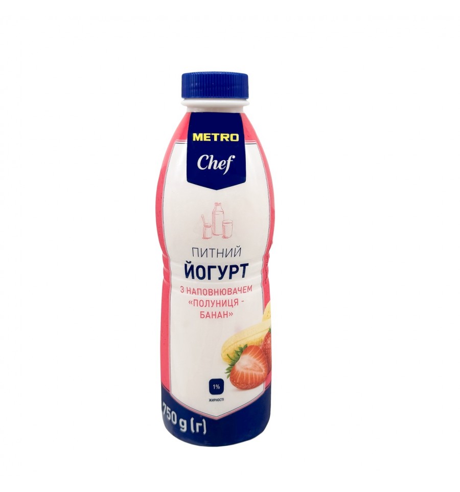 Йогурт питьевой с наполнителем «Клубника-банан» 1,0% жирности, ТМ «METRO Chef»ТУ У 00447847-001-99 Состав: МОЛОКО нормализованное; сахар; наполнитель фруктовый пастеризо[1]ванный «Клубника-банан» (3,0%) (сахар; сок клубничный восстановленный (11,16%); клубника (7,84%); банан (6,0%); вода; пюре яблочное; модифицирующий[1]ный крахмал дерева гуаровая камедь; ароматизатор «Ваниль-сливки»; модифицированный крахмал кукурузный; закваска бактериальная.Количество молочнокислых бактерий, КОЕ в 1 ml (мл), не менее 1·10^7.Питательная ценность на 100 g(г) продукта: энергетическая ценность 288,6 kJ(кДж)/68,2 kcal(ккал); жиры 1,0 g(г), из них насыщены 0,65 g(г); углеводы 13,1 g(г), из них сахара 11,5 g(г), белки 1,7 g(г); соль 0,15 g (г). «Применить к»: смотри нижнюю строчку на верхней части бутылки. Номер партии (L): смотри верхнюю строчку на верхней части бутылки. Хранить при температуре (4±2)°С. Производитель, адрес мощности (объекта) производства: ООО «Молочный Дом», ул. Харьковская, 1-в, г. Павлоград, Днепропетровская область, 51400, Украина. Изготовлено по заказу: ООО «Метро Кэш энд Кери Украина», 02140, г. Киев, просп. П. Григоренко, 43. По вопросам продукта обращайтесь по телефону горячей линии: 0 800 501 401 (бесплатно в пределах Украины). Масса нетто: 750 г(г). Допустимое отрицательное отклонение содержимого упакованной единицы 15 g (г)
