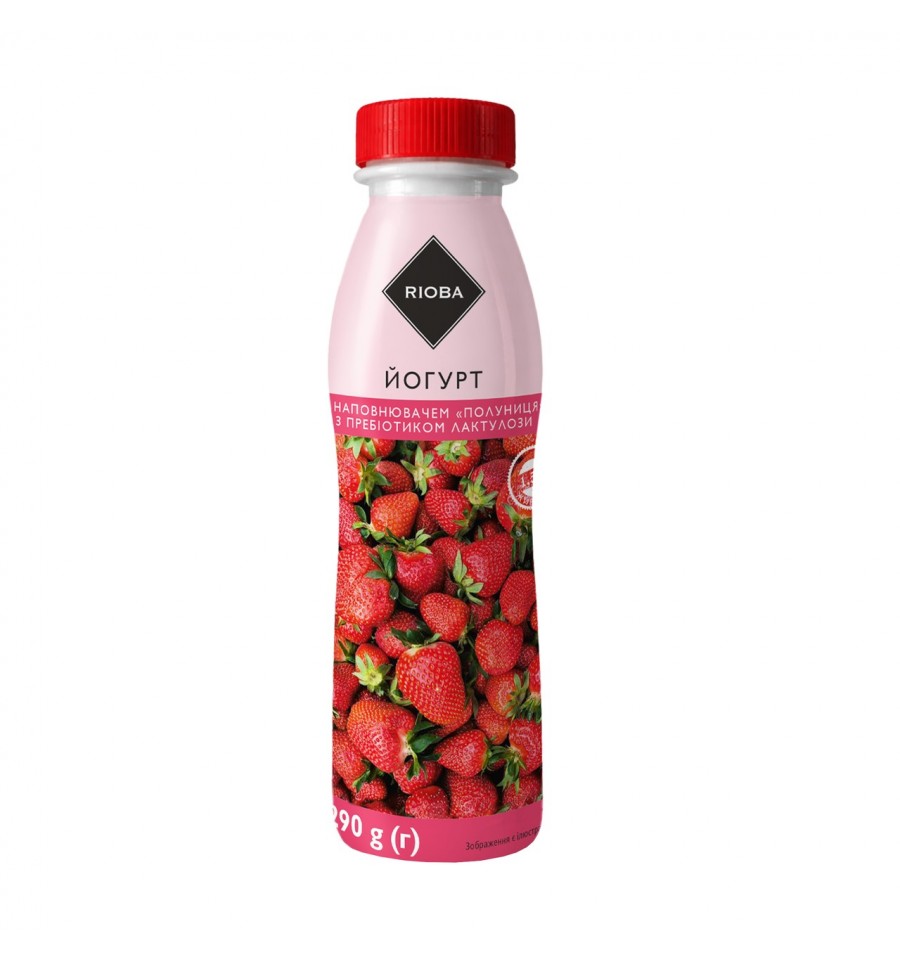 Йогурт с наполнителем «Клубника» с пребиотиком лактулозы 1,5% жирности, ТМ «RIOBA» ТУ У 00447847-001-99. Состав: МОЛОКО нормализованное, фруктовый наполнитель пастеризованный «Клубника» с ЛАКТУЛОЗОЙ 7% (40% клубника, сахар, вода, сахарный сироп, модифицированный крахмал кукурузный, 2,16% пребиотик концентрат ЛАКТУЛОЗЫ, ароматизатор, стабилизаторы кара красители кармины, регулятор кислотности цитрат натрия, натуральные красители β-каротины), сахар, закваска йогуртная. Количество жизнеспособных молочнокислых бактерий, КОЕ в 1 ml (мл), не менее 1·10^7. (кДж)/67,9 kcal (ккал); жиры 1,5 g(г), из них насыщены 0,98 g(г); углеводы 11,1 g(г), из них сахара 10,8 g(г), из них лактулозы 0,1 g; белки 2,5 g(г); соль 0,11 g (г).Применить к»: смотри нижнюю строчку на верхней части бутылки.Номер партии (L): смотри верхнюю строчку на верхней части бутылки. Хранить при температуре (4±2)°С. Производитель, адрес мощности (объекта) производства: ООО «Молочный Дом», ул. Харьковская, 1-в, г. Павлоград, Днепропетровская область, 51400, Украина. Изготовлено по заказу: ООО «Метро Кэш энд Кери Украина», 02140, г. Киев, просп. П. Григоренко, 43. По вопросам продукта обращайтесь по телефону горячей линии: 0 800 501 401 (бесплатно в пределах Украины). Масса нетто: 290 г(г). Допустимое отрицательное отклонение содержимого упакованной единицы 9 g (г)