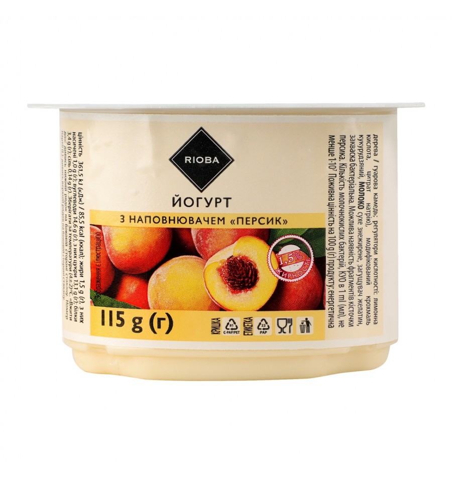 Йогурт Rioba Персик с наполнителем 1.5% 115г. Состав: молоко обезжиренное, сахар, сливки (молоко), фруктовый наполнитель пастеризованный персик (3%) (сахар, персик (13.3%), пюре персика восстановленное (11.7%), вода, сахарный сироп, пюре яблочное, модифицированный крахмал В-каротин/экстракт паприки, стабилизаторы: камедь рожкового дерева/гуаровая камедь, регуляторы кислотности: лимонная кислота, цитрат натрия), модифицированный крахмал кукурузный, сухое обезжиренное молоко, загуститель желатин, закваска бактериальная. Энергетическая ценность продукта: 361.5кДж/100г, 85.5ккал/100г. Питательная (пищевая) ценность продукта: белки – 3.4г/100г, жиры – 1.5г/100г, насыщенные жиры – 13.6г/100г, углеводы – 14.6г/100г, из них сахара – 13.1г/100г, соль. Массовая доля жира: 1,5%. Условия хранения: хранить при температуре +4 (+/-2)ºC. Срок годности: 41 день. Страна изготовитель: Украина. Производитель: ООО Молочный Дом. Адрес производственных мощностей: ул. Харьковская, 1-в, г. Павлоград, Днепропетровская обл., Украина, 51400. Масса нетто: 115г.