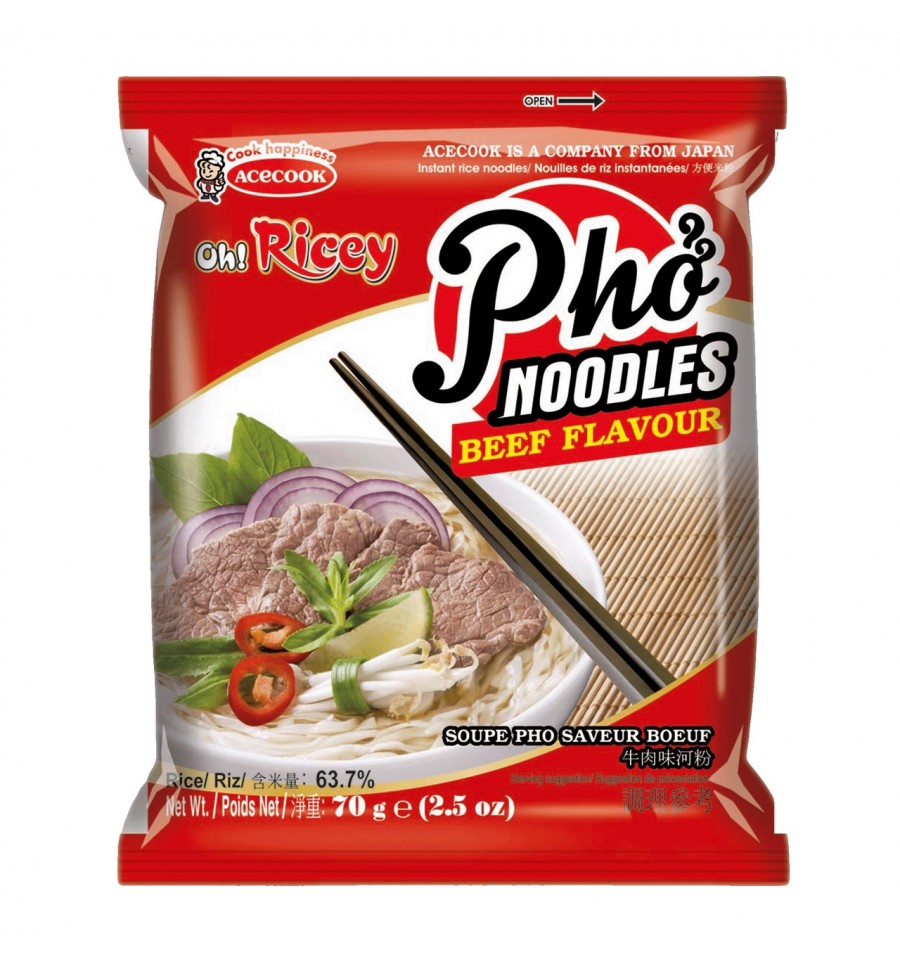 Рисовая лапша быстрого приготовления со вкусом говядины. ACECOOK OH! RICEY. Состав: Рисовая лапша (76,6%): рис 63,7%, загуститель (крахмал окисленный (Е1404)), крахмал, соль, эмульгаторы (соевый лецитин (Е322), натрия карбоксиметилцеллюлоза (Е466). натрия (Е621), инозинат натрия (Е631), гуанилат натрия (Е627), крахмал, экстракт дрожжей, порошок соевого соуса (пшеница, соевые бобы), лимонная кислота (Е330) масло олово (иол) (Е320),бутилгидрокситолуол (Е321))),искусственный ароматизатор говядины 0,1%,специи. Способ приготовления: - Положите рисовую лапшу в миску и насыпьте содержимое пакетиков с приправами. 1657кДж /393 ккал. Питательная (пищевая) ценность на 100г продукта: жиры - 9,8г (из которых углеводы - 69,0г (из которых сахара - 6,9г); VIETNAM JSC (завод японской компании ACECOOK), Rot No. 08320,Украина. Тел.: 0443912379 mail@fdmsukraine.com.