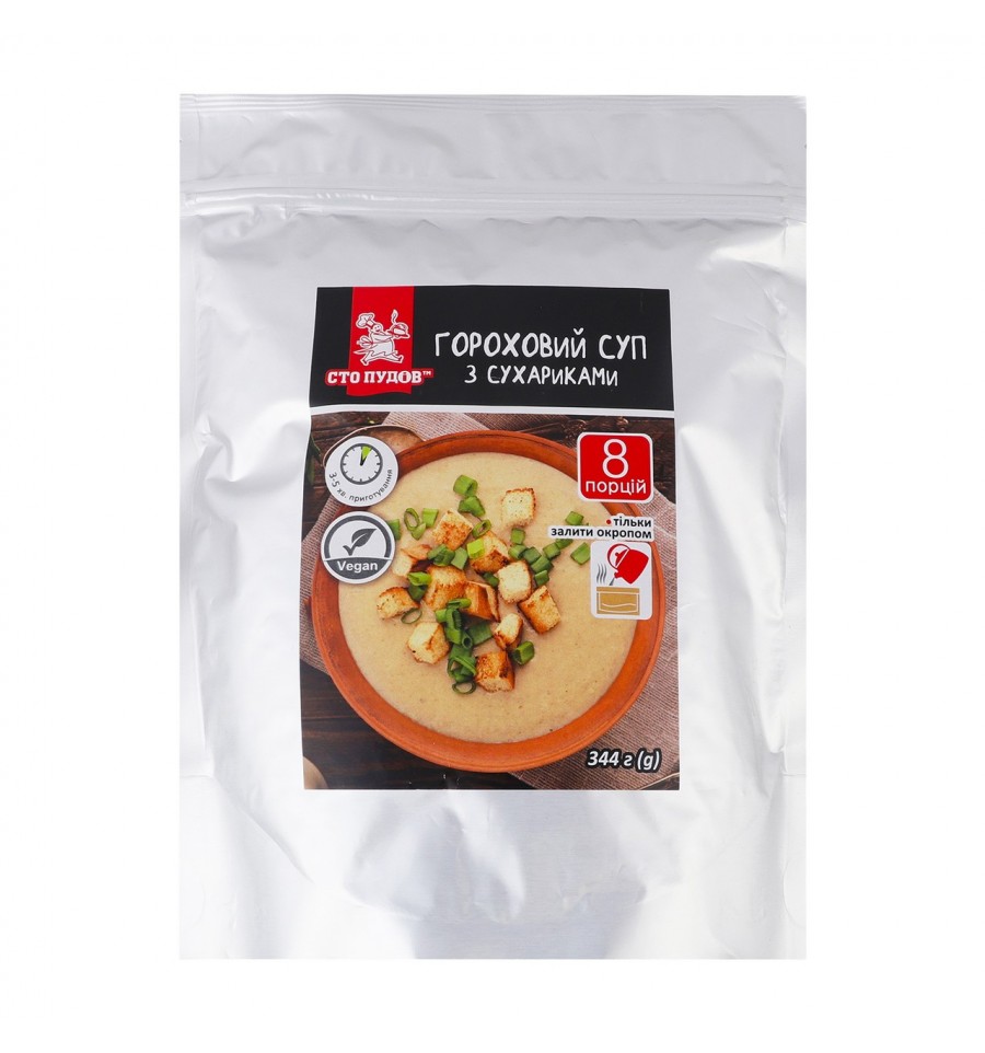 Суп гороховый Сто пудов с сухариками 344г. Состав: пакет №1: хлопья гороховые, лук жареный сушеный, соль, укроп сушеный, лук зеленый сушеный. Пакет №2: сухарики из пшеничной муки (мука пшеничная, дрожжи хлебопекарные, соль). Энергетическая ценность продукта: 1273.6кДж/100г, 304.2ккал/100г. Питательная (пищевая) ценность продукта: белки – 18.83г/100г, жиры – 1.99г/100г, насыщенные жиры – 0.34г/100г, углеводы – 51.72г/100г, из них сахара – 5.47г/100г. Рекомендуемые способы применения/применения: на одну порцию: содержимое пакета перемешать. В небольшую емкость высыпать 3-4ст. ложки консистенции. Залить 200-250 мл кипятка. Тщательно перемешать. Дать постоять 3-5 минут. По желанию добавить сливочное масло. Приятного аппетита! На 8 порций 1.7л кипятка. Условия хранения: хранить при температуре не выше +20ºC и относительной влажности воздуха не более 75%. Чистое, сухое, хорошо вентилируемое, без попадания прямых солнечных лучей и вредителей место. Срок годности: 1 год. Страна изготовитель: Украина. Производитель и адрес производителя: ООО "Продэнерго", ул. Гв. Широнинцев, 45, г. Харьков, Украина, 61170. Адрес производственных мощностей: ул. Гв. Широнинцев, 45, г. Харьков, Украина, 61170. Масса нетто: 344г.