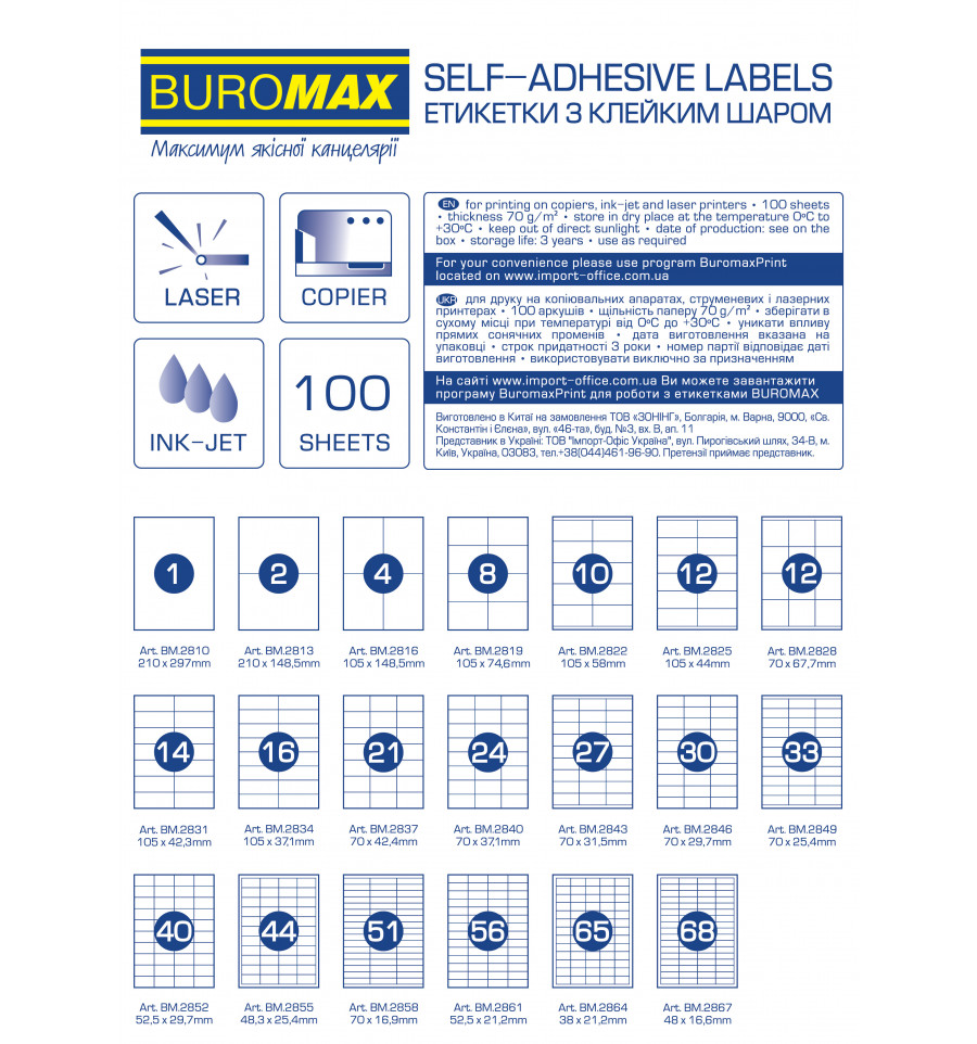 Самоклеящиеся этикетки BUROMAX — универсальные этикетки с клейким слоем, которые используются для печати на лазерных, струйных принтерах и копировальных аппаратах. Представлены в белом цвете, различных размеров на листе формата А4. Этикетки удобны в широком применении для: маркировки любого вида продукции (штрих-кода, QR-кода) нанесения графической, текстовой информации (объявления, указатели) товара и складского сервиса (магазины, торговые центры, складские комплексы) почтовой рассылки (бандероли, посылки, конверты) архивирования документов и делопроизводства (картотеки, папки) использования в домашних условиях (коробки с вещами и т.д) Качественный материал этикеток обеспечивает четкую печать и прочную клейкость на любой поверхности. Рекомендации: при создании дизайна или текста на этикетках учитывать погрешность позиционирования бумаги в принтере (1-3 мм) при печати этикеток в настройках принтера необходимо выбирать тип бумаги — «этикетка» хранить в сухом месте при температуре от 0 º до 30º С СКАЧАТЬпрограммаBuroMAX Print