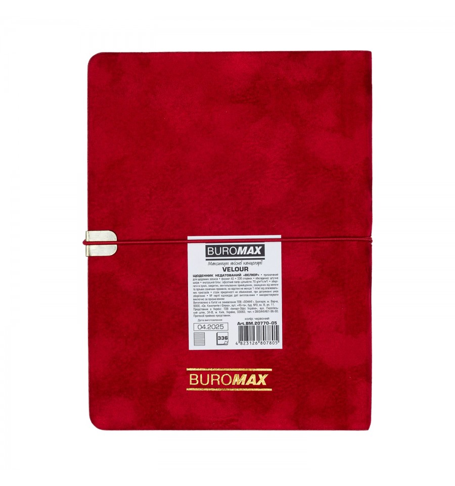 Дневники BUROMAX – это всегда широкий выбор самых разных обложек, фактур и цветов. Мы найдем подход к сердцу каждого покупателя!Гибкая обложка дневника VELOUR выполнена из искусственной кожи с выразительным бархатным покрытием. Две функциональные шильды на лицевой и обратной стороне обложки с углублениями и аккуратно ложащаяся на них поперечная резинка обеспечивают надежную фиксацию дневника в закрытом состоянии. Дизайн гармонично дополняет и обогащает срез внутреннего блока и тиснение серебряной фольгой надписи на лицевой стороне обложки.Недатированный дневник сохранил преимущества датированного дневника, но вместе с тем не зависит от дат, позволяющих вести записи без хронологии и в произвольном порядке.Формат А5 336 страниц Гибкая обложка из искусственной кожи Внутренний блок: офсетная бумага кремового цвета плотностью 70 г/м² Закладка-лесе в цвет обложки поможет быстро найти необходимую страницу. Перфорированные уголки листов Карты Украины и Европы на форзацах Индивидуальная упаковка: картонная коробка Структура внутреннего блока:Страница для внесения личной информации Планинг на год Информационно-справочный блок: телефонные коды мобильных операторов и областных центров Украины, буквенные автомобильные коды стран, таблица расстояний между областными центрами Украины, справочник систем измерения, международные знаки соответствия, знаки ухода за одеждой Недатированные страницы с линией в линию имеют строку для надписи даты Алфавитная книга для внесения контактов Дневник BUROMAX формата А5 – это выбор, проверенный временем, самый популярный формат для незаменимого помощника в планировании Вашего рабочего дня!