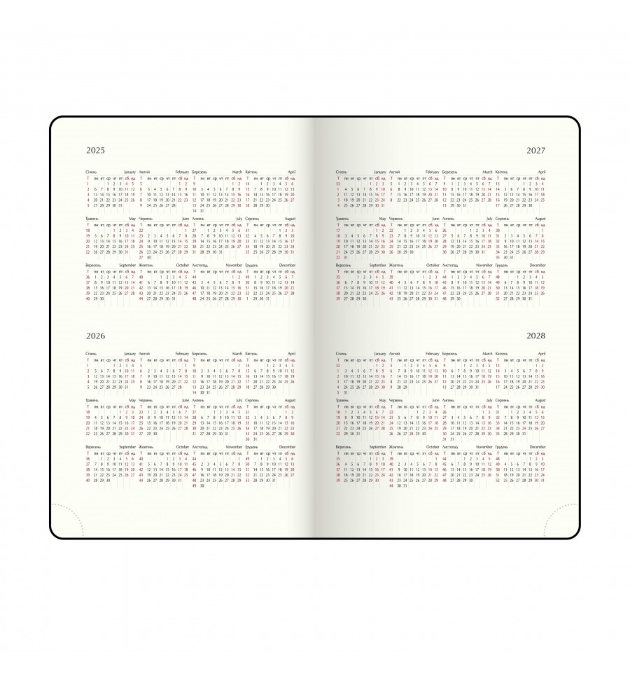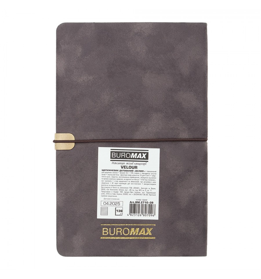 Еженедельники BUROMAX – это удобный аксессуар для еженедельного планирования своей деловой и личной деятельности.Гибкая обложка еженедельника VELOUR выполнена из искусственной кожи с выразительным бархатным покрытием. Две функциональные шильды на лицевой и оборотной стороне обложки с углублениями для поперечной резинки обеспечивают удобную и надежную фиксацию дневника в закрытом состоянии. Дизайн гармонично дополняет и обогащает тонированный серебряным цветом срез внутреннего блока и тиснение серебряной фольгой рока и надписи на лицевой стороне обложки.Формат А5 136 страниц Внутренний блок: офсетная бумага кремового цвета плотностью 70 г/м² Закладка-лесое в цвет обложки Перфорированные уголки Печать блока в 2 цвета: серый и бордовый Два языка блока: украинский, английский Карты Украины и Европы на форзацах Индивидуальная упаковка: картонная коробка Структура внутреннего блока:Лист для внесения личной информации Календари на 2025 – 2028 годы Планинг на 2026 год Информационно-справочный блок: национальные, религиозные, профессиональные праздники и памятные даты, знаки зодиака, телефонные коды мобильных операторов и областных центров Украины, буквенные автомобильные коды стран, таблица расстояний между областными центрами Украины, справочник систем измерения, международные знаки соответствия, знаки ухода за одеждой На одной странице горизонтально размещено три/четыре дня недели (суббота и воскресенье - вертикальное расположение на одной части), с организатором времени от 9:00 до 18:00, указанием месяца, года, дня недели и даты Алфавитная книга для внесения контактов Еженедельник BUROMAX – незаменимый помощник в планировании Вашего рабочего времени!