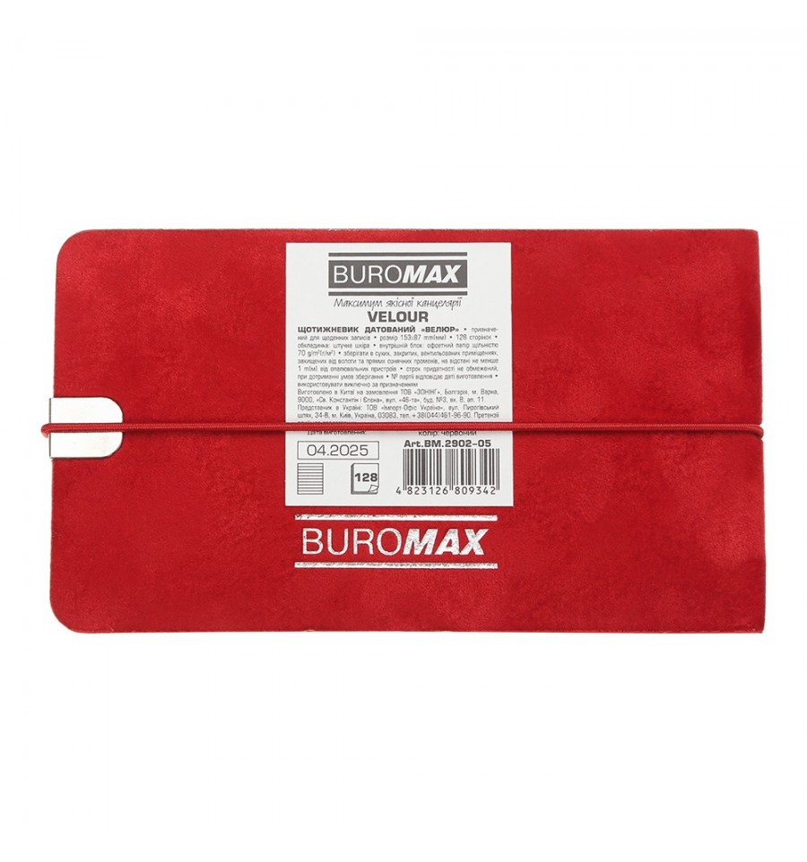 Еженедельники BUROMAX – это удобный аксессуар для еженедельного планирования своей деловой и личной деятельности.Гибкая обложка еженедельника VELOUR выполнена из искусственной кожи с выразительным бархатным покрытием. Две функциональные металлические шильды на лицевой и оборотной стороне обложки с углублениями для поперечной резинки обеспечивают надежную фиксацию дневника в закрытом состоянии. Дизайн обогащает тонированный золотым срез и тиснение золотой фольгой года на лицевой стороне обложки. Карманный размер еженедельника делает его постоянным спутником своего владельца, он не займет много места даже в маленькой сумочке и всегда будет под рукой.Размер 153х87 мм (карманный) 128 страниц Внутренний блок: офсетная бумага кремового цвета плотностью 70 г/м² Закладка-лесое в цвет обложки Печать блока в 2 цвета: серый и бордовый Два языка блока: украинский, английский Индивидуальная упаковка: картонная коробка Структура внутреннего блока:Лист для внесения личной информации Календари на 2025 – 2027 годы Информационно-справочный блок: национальные, религиозные, профессиональные праздники и памятные даты, знаки зодиака, буквенные автомобильные коды стран, таблица расстояний между областными центрами Украины, справочник систем измерения, международные знаки соответствия, знаки ухода за одеждой На одной странице вертикально размещены три/четыре дня недели, с организатором времени от 8:00 до 20:00, указанием месяца, дня недели и даты Алфавитная книга для внесения контактов Еженедельник BUROMAX – незаменимый помощник в планировании Вашего рабочего времени!