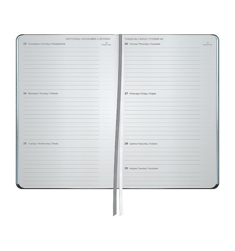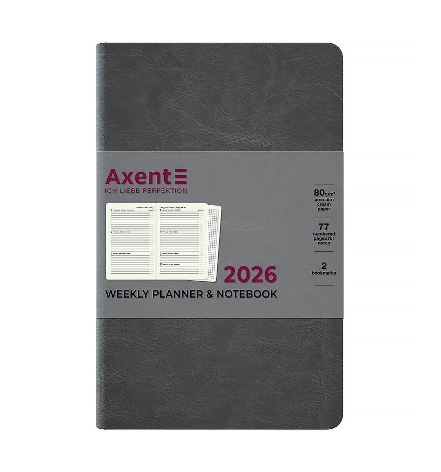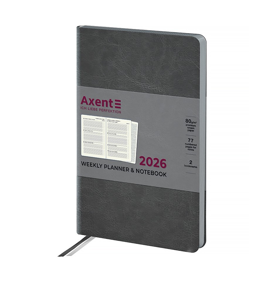 Еженедельник Axent формата А5- из серии City с мягкой обложкой и серебряным срезом. Используется для ежедневных записей, деловых и творческих задач.Мягкая обложка из PU-материала помогает сохранить аккуратный и презентабельный вид в течение длительного времени. Качественная кремовая бумага плотностью 80 г/м2 хорошо впитывает чернила и обеспечивает комфортное письмо. Еженедельник разделен на 2 части – датированный блок в линию для удобной планировки дел и дополнительные страницы в ячейку для ведения личных записей.Внутренний блок на украинском языке. Планер содержит календарь на 2026-2027 год, общее недельное расписание, информацию о праздниках, важные номера телефонов, часовые пояса стран мира, единицы измерения, шкалу температур.Две разноцветные закладки-ляссе позволяют быстро найти и открыть нужные страницы. Содержит 96 листов, размер – 125*195 мм. Карманы на форзаце нет. Нет тесьмы на обложке и петли для ручки.