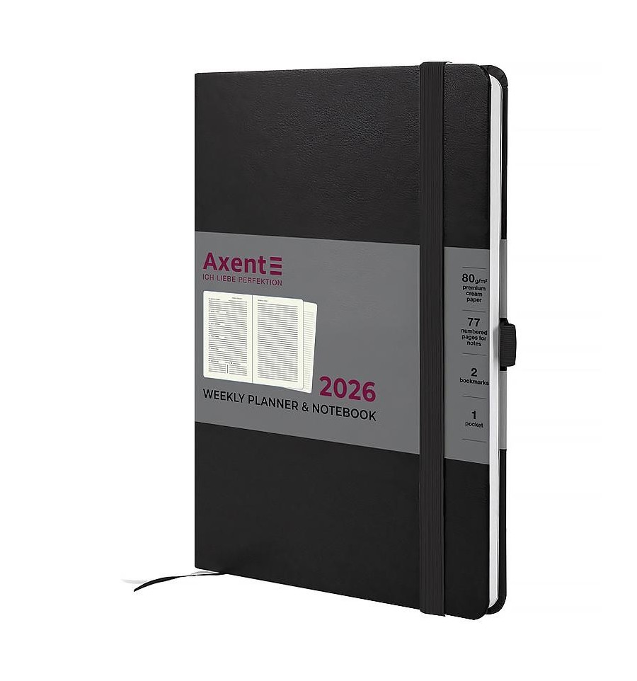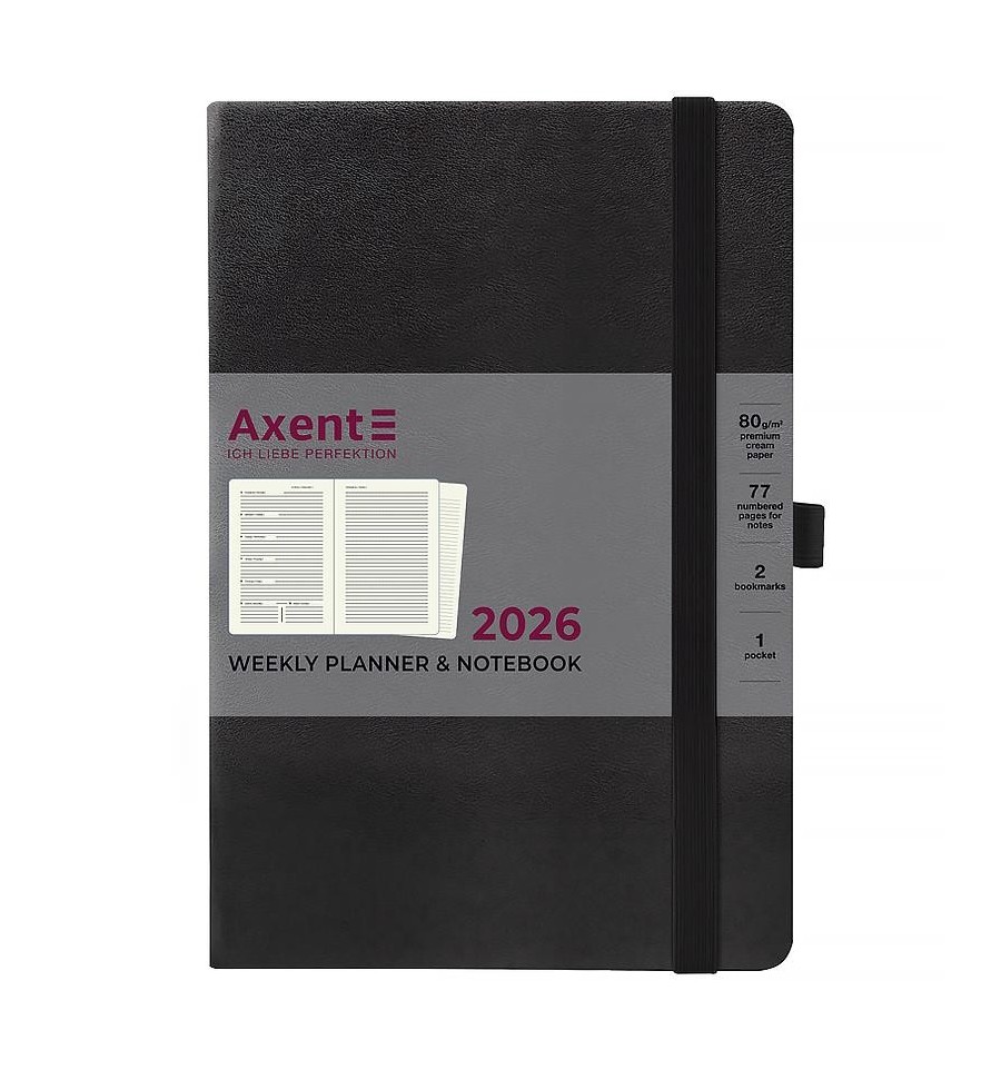 Удобный еженедельник Axent из серии Strong в твердом переплете. Используется для ежедневных записей, деловых и творческих задач.Твердый переплет из винила помогает сохранить аккуратный и презентабельный вид в течение долгого времени. Качественная кремовая бумага плотностью 80 г/м2 хорошо впитывает чернила и обеспечивает комфортное письмо. Удобно делать записи, чертить и рисовать. Еженедельник разделен на 2 части – датированный блок в линию для удобной планировки дел и дополнительные страницы в линию для ведения личных записей.Внутренний блок на украинском языке. Планер содержит календарь на 2026-2027 год, общее недельное расписание, информацию о праздниках, важные номера телефонов, часовые пояса стран мира, единицы измерения, шкалу температур.Две разноцветные закладки-ляссе позволяют быстро найти и открыть нужные страницы. карманный на форзаце. Содержит 96 листов, размер – 145*210 мм.