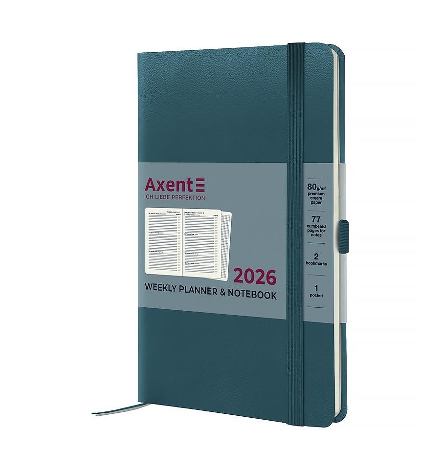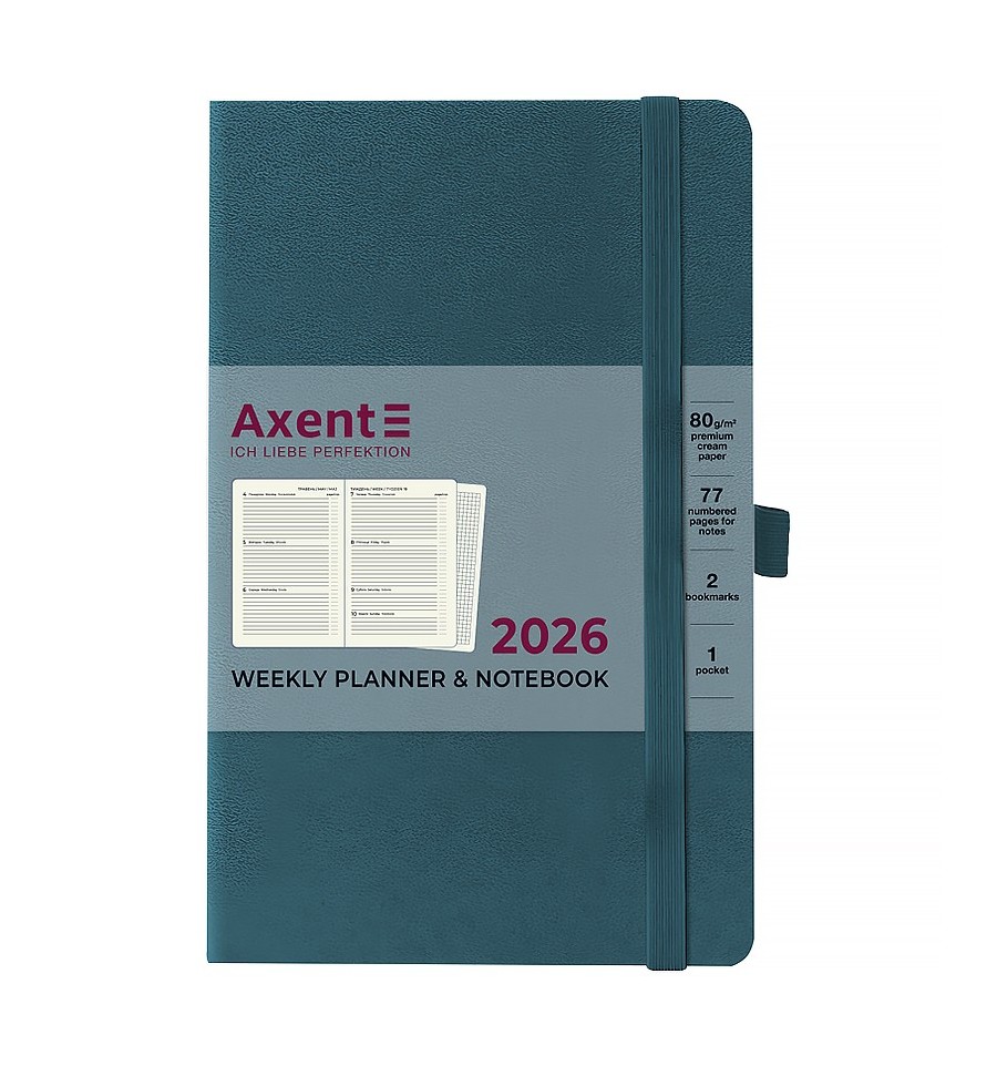Еженедельник Axent формата А5- из серии Soft Skin в мягком переплете с текстурой под кожу. Используется для ежедневных записей, деловых и творческих задач.Мягкая обложка помогает сохранить аккуратный внешний вид в течение длительного времени. Качественная кремовая бумага плотностью 80 г/м2 хорошо впитывает чернила и обеспечивает комфортное письмо. Удобно делать записи, чертить и рисовать. Еженедельник разделен на 2 части – датированный блок в линию для удобной планировки дел и дополнительные страницы в ячейку для ведения личных записей.Две разноцветные закладки-ляссе позволяют быстро найти и открыть нужные страницы. карманный на форзаце надежно хранит заметки, чеки, карточки и другие важные мелочи. Эластичная тесьма предотвращает самопроизвольное открывание. Содержит 96 листов, размер – 125*195 мм.