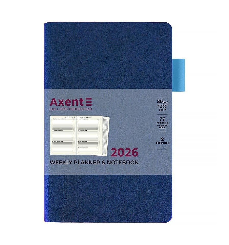 Еженедельник Axent формата А5- из серии Muse с мягкой обложкой и цветным срезом. Используется для ежедневных записей, деловых и творческих задач.Мягкая обложка из PU-материала помогает сохранить аккуратный и презентабельный вид в течение длительного времени. Качественная кремовая бумага плотностью 80 г/м2 хорошо впитывает чернила и обеспечивает комфортное письмо. Еженедельник разделен на 2 части – датированный блок в линию для удобной планировки дел и дополнительные страницы в ячейку для ведения личных записей.Внутренний блок на украинском языке. Планер содержит календарь на 2026-2027 год, общее недельное расписание, информацию о праздниках, важные номера телефонов, часовые пояса стран мира, единицы измерения, шкалу температур.Две разноцветные закладки-ляссе позволяют быстро найти и открыть нужные страницы. Содержит 96 листов, размер – 125*195 мм. карманныйы на форзаце нет. Нет тесьмы на обложке. Есть петля для ручки.