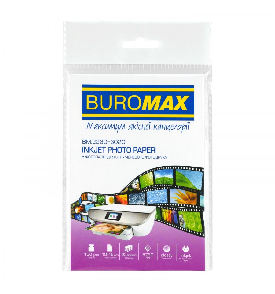 Глянцевая фотобумага от BUROMAX предназначена для струйной фотопечати в пределах повседневных фотопроектов, для создания профессиональных и любительских изображений. Может использоваться широким кругом пользователей, включая офисных работников, типографий, фотолабораторий и домашних пользователей для печати фотографий.• глянцевая поверхность – позволяет передавать тонкие цветовые градации и их оттенков, обеспечивает большую насыщенность изображения и лучшую защиту снимков от влаги. • подходит для принтеров с разрешением печати до 5760 dpi • быстро высыхает, что позволяет оперативно работать со снимкамиТехнические характеристики размер 10х15 см • количество листов – 20 • плотность, г/м² – 150 • белье бумаги (ISO) – 95%• непрозрачность бумаги – (95-100)% • тип бумаги – глянцевый • тип печати – струйнаяСостав бумага