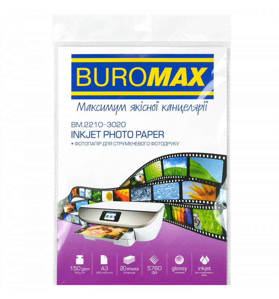 Глянцевая фотобумага от BUROMAX предназначена для струйной фотопечати в пределах повседневных фотопроектов, для создания профессиональных и любительских изображений. Может использоваться широким кругом пользователей, включая офисных работников, типографий, фотолабораторий и домашних пользователей для печати фотографий.• глянцевая поверхность – позволяет передавать тонкие цветовые градации и их оттенков, обеспечивает большую насыщенность изображения и лучшую защиту снимков от влаги. • подходит для принтеров с разрешением печати до 5760 dpi • быстро высыхает, что позволяет оперативно работать со снимкамиТехнические характеристики • формат – А3 • количество листов – 20 • плотность, г/м² – 150 • белье бумаги (ISO) – 95%• непрозрачность бумаги – (95-100)% • тип бумаги – глянцевый • тип печати – струйнаяСостав бумага