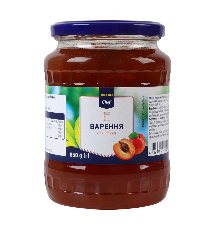 Варенье Metro Chef из абрикосов стерилизовано высший сорт 850г. Состав: сахар – 50%, абрикосы быстрозамороженные – 50%. Энергетическая ценность продукта: 936кДж/100г, 224ккал/100г. Питательная (пищевая) ценность продукта: белки – 0.7г/100г, жиры – <0.5г/100г, насыщенные жиры – 0г/100г, углеводы – 56г/100г, из них сахара – 55г/100г, соль – 0г/100г. Условия хранения: хранить при температуре 0..+25ºC и относительной влажности воздуха не более 75%. Без попадания прямых солнечных лучей. Предостережения/меры безопасности: в случае отсутствия хлопка при открывании банки продукт потреблять нельзя. Срок годности: 2 года. Страна изготовитель: Украина. Производитель и адрес производителя: ООО Мастер-Фуд, ул. Гагарина, 26, пос. Соленое, Солонянский р-н, Днепропетровская обл., Украина, 52400. Адрес производственных мощностей: ул. Танцюрина Балка, 6, г. Днепр, Днепропетровская обл., Украина, 49035. Масса нетто: 850г.
