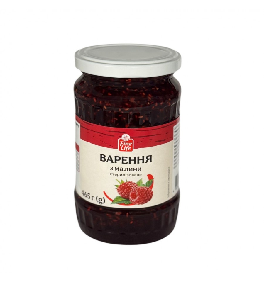Варенье Fine Life из малины стерилизованное высший сорт 465г. Состав: сахар, малина быстрозамороженная 40%. Энергетическая ценность продукта: 1186кДж/100г, 279ккал/100г. Питательная (пищевая) ценность продукта: белки – 0.3г/100г, жиры – 0.2г/100г, насыщенные жиры – 0.04г/100г, углеводы – 69г/100г, из них сахара – 69г/100г, соль – 0.0. Рекомендуемый способ приготовления/употребления: продукт готов к употреблению. В случае отсутствия хлопка при открывании банки продукт потреблять нельзя. Условия хранения: хранить при температуре 0..+25ºC и относительной влажности воздуха не более 75%. Срок годности: 2 года. Страна изготовитель: Украина. Производитель и адрес производителя: ООО "Фита Трейд", просп. Богдана Хмельницкого, 139, г. Днепр, Украина, 49000. Оператор рынка и адрес оператора рынка: ООО "Фита Трейд", просп. Богдана Хмельницкого, 139, г. Днепр, Украина, 49000. Изготовлено по заказу и адресу заказчика: ООО Метро Кеш энд Кери Украина, просп. П. Григоренко, 43, г. Киев, Украина, 02140. Масса нетто: 465г.