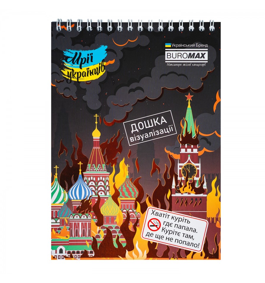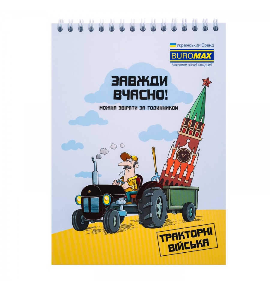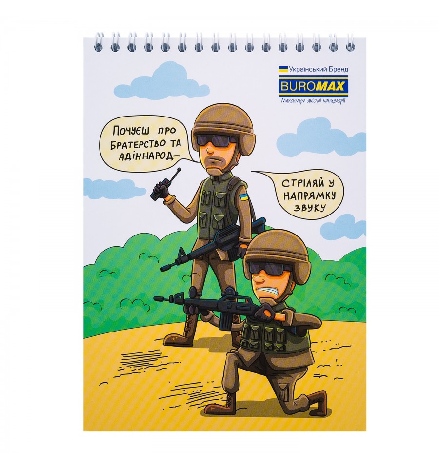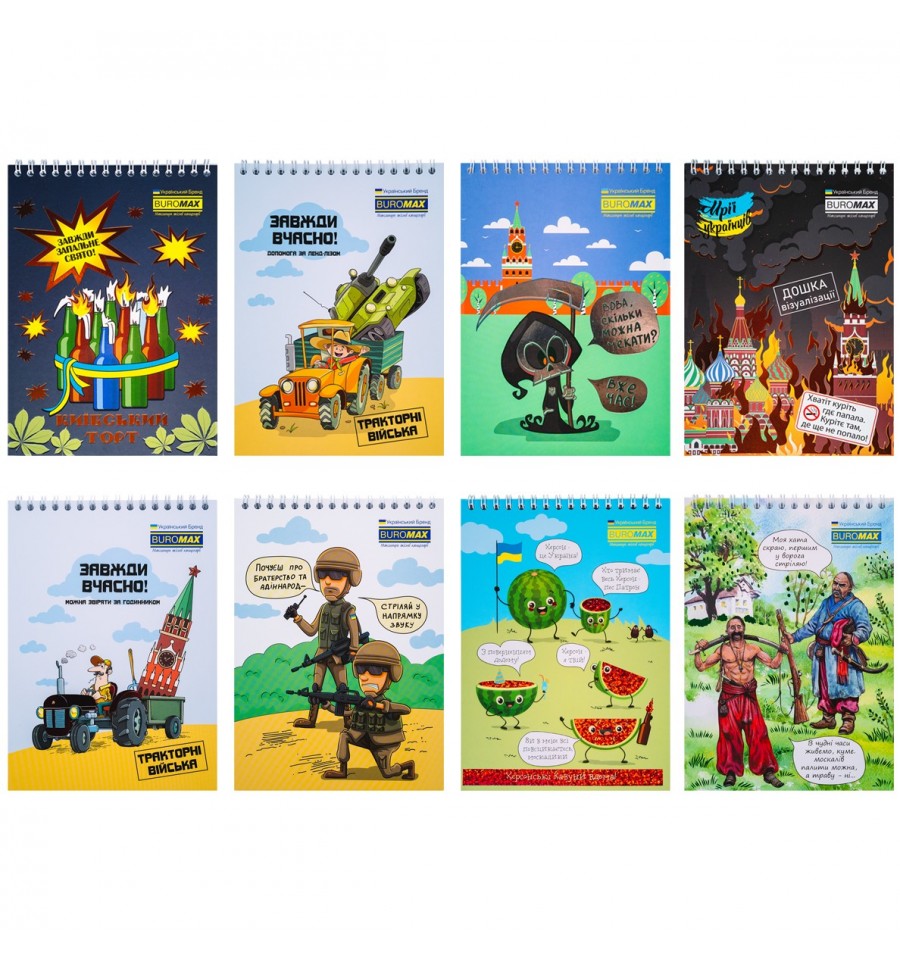 Блокноты PATRIOT от BUROMAX – это актуальное решение для сохранения записей, заметок, мнений. Интересные обложки, содержащие мотивирующие высказывания, направленные на зарядку позитивом, верой в крепость и победу, имеют визуализацию мыслей и мечт многих людей, обязательно понравятся широкому кругу как маленьких, так и взрослых украинцев. Благодаря линейке очень разнообразных дизайнов такой блокнот может стать приятным актуальным подарочком или незаменимым другом для каждого.Формат ±А5 Крепление сверху на металлической пружине позволяет легко переворачивать листы (все ложится идеально). Линирование клетка, без рамки 48 листов Внутренний блок – офсетная бумага белого цвета плотностью 55 г/м² Обложка из мелованного целлюлозного картона плотностью 230 г/м² Полиграфические эффекты обложки – выборочный УФ лак и тиснение фольгой в тон дизайна. Групповая упаковка: 8 шт. ассорти дизайнов (8 дизайнов) 1 гривна на ВСУ (1 грн с покупки данного товара ООО "Импорт-Офис Украина" перечислит в фонд "Вернись живым")