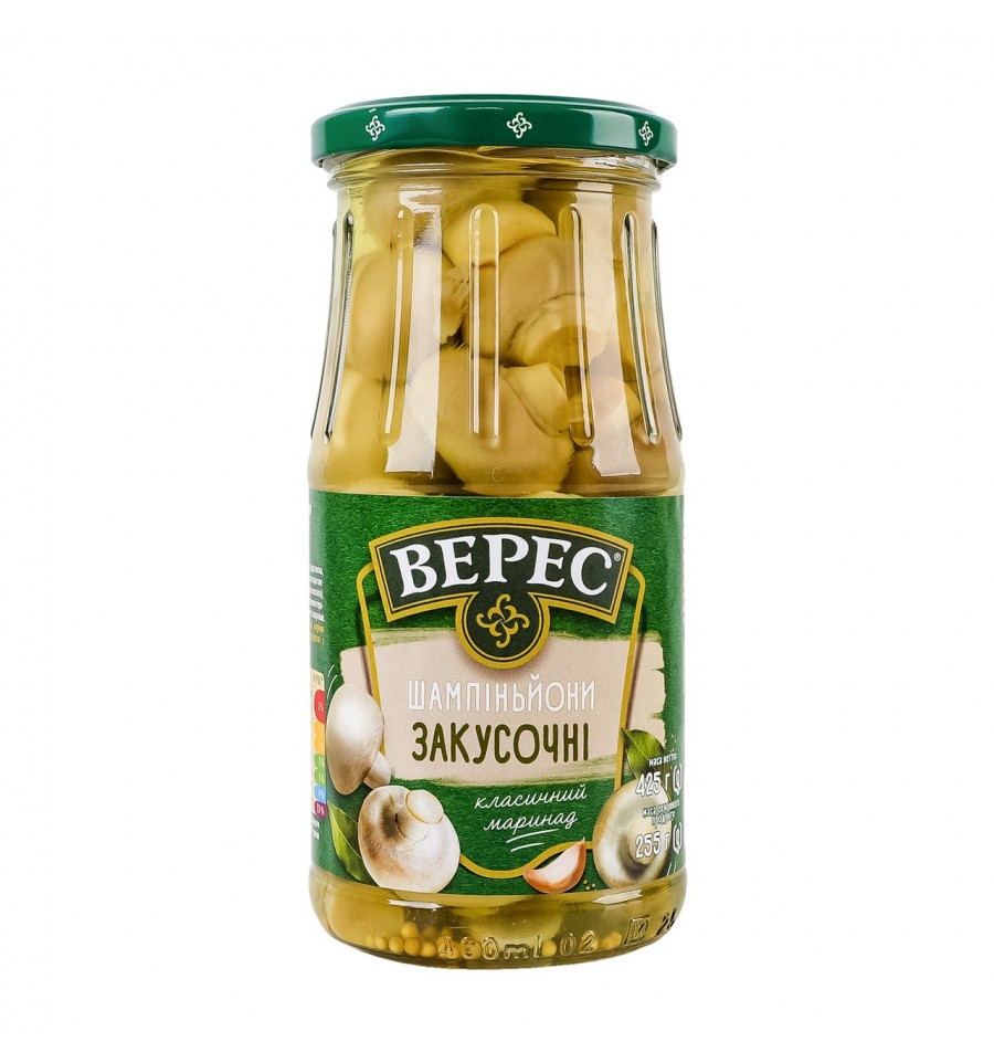 Шампиньоны Верес Закусочные маринованные стерилизованные первый сорт 425г. Состав: грибы шампиньоны (60%), вода питьевая, сахар, соль поваренная, чеснок, регуляторы кислотности (уксусная кислота, лимонная кислота), семена горчицы белой, перец душистый горошек, перец черный горошек, лист лавровый. Энергетическая ценность продукта: 179кДж/100г, 42ккал/100г. Питательная (пищевая) ценность продукта: белки – 2.2г/100г, жиры – 0.5г/100г, насыщенные жиры – 0.1г/100г, углеводы – 7.1г/100г, из них сахара – 4.2г/100г, соль – 2. Условия хранения: хранить при температуре 0..+25ºC и относительной влажности воздуха не более 75%. Без попадания прямых солнечных лучей. Срок годности: 18 месяцев. Страна изготовитель: Украина. Производитель и адрес производителя: ООО Виджи Продакшн, ул. Гетмана Михаила Дорошенко, дом. 1, г. Канев, Черкасский р-н, Черкасская обл., Украина, 19000. Адрес производственных мощностей: ул. Гетмана Михаила Дорошенко, дом. 1, г. Канев, Черкасский р-н, Черкасская обл., Украина, 19000. Масса нетто: 425г.