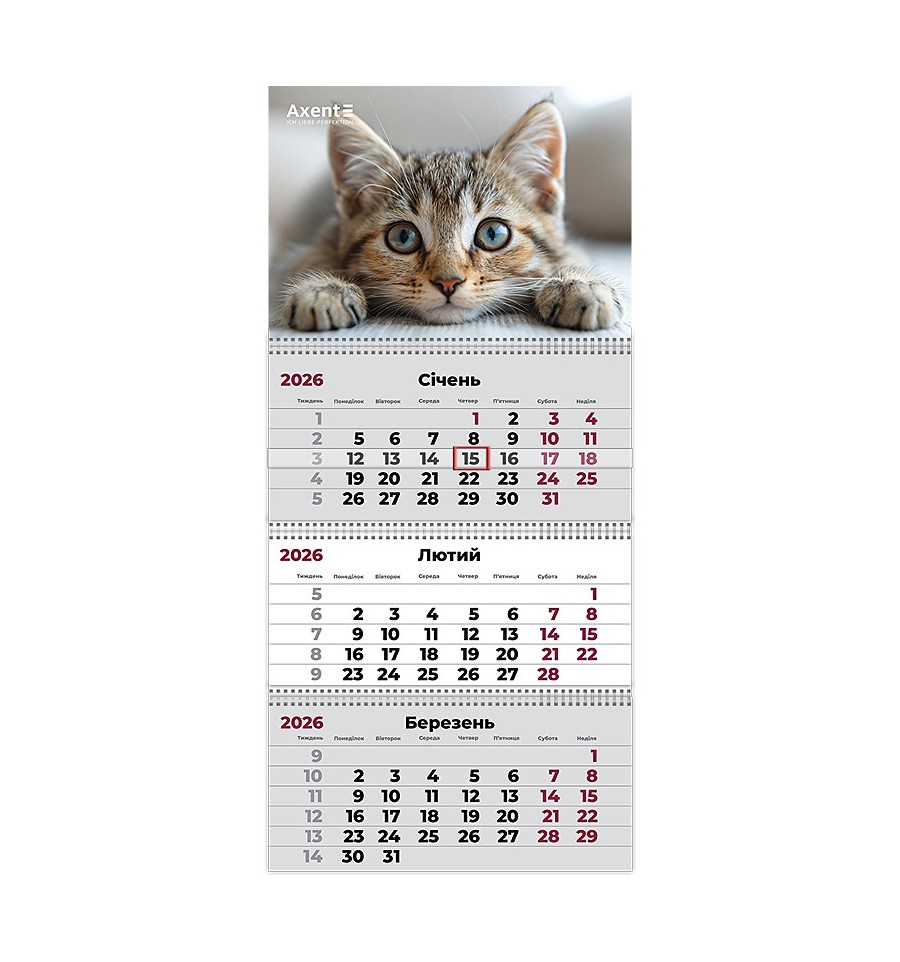 Календарь настенный квартальный Axent 8801-26-13-A на 2026 год – незаменимый помощник по планированию повседневных задач и подготовке отчетности. С ним вы всегда будете ориентироваться в датах, рабочих и выходных днях; оценивать продолжительность задач и планировать важные события.Дизайн квартального календаря – максимально функциональный и эстетичный. Имеет плотное картонное основание. Визуальный охват трех месяцев – самое удобное для работы. Имеет перфорированный блок с 12 листами. Пружинный крепеж – практичный и надежный. Листы легко пролистываются и при необходимости аккуратно вырываются.Календарь с бегунком не даст потеряться в днях. Высококачественная полноцветная печать идеально передает всю красоту изображения. На гладких белых листах удобно отмечать даты и делать отметки. Имеет большие цифры и разборчивый шрифт с нумерацией недель.Календари Axent – стильное украшение офиса. Индивидуальная упаковка защищает каждый календарь и подчеркивает его статусность.Особенности:Настенный квартальный календарь на 1 пружину. На одном листе 3 месяца, размер изделия 297*630 мм. Размер постера 297*210 мм, изготовлен из высококачественного картона. Календарный блок состоит из 12 отрывных листов размером 297*420 мм, изготовленных из мелованной бумаги. Календарная сеть на украинском языке. Указатель дат с бегунком и крепежное отверстие. Каждый календарь в индивидуальной упаковке.