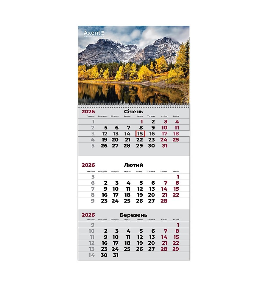 Календарь настенный квартальный Axent 8801-26-8-A на 2026 год – незаменимый помощник по планированию повседневных задач и подготовке отчетности. С ним вы всегда будете ориентироваться в датах, рабочих и выходных днях; оценивать продолжительность задач и планировать важные события.Дизайн квартального календаря – максимально функциональный и эстетичный. Имеет плотное картонное основание. Визуальный охват трех месяцев – самое удобное для работы. Имеет перфорированный блок с 12 листами. Пружинный крепеж – практичный и надежный. Листы легко пролистываются и при необходимости аккуратно вырываются.Календарь с бегунком не даст потеряться в днях. Высококачественная полноцветная печать идеально передает всю красоту изображения. На гладких белых листах удобно отмечать даты и делать отметки. Имеет большие цифры и разборчивый шрифт с нумерацией недель.Календари Axent – стильное украшение офиса. Индивидуальная упаковка защищает каждый календарь и подчеркивает его статусность.Особенности:Настенный квартальный календарь на 1 пружину. На одном листе 3 месяца, размер изделия 297*630 мм. Размер постера 297*210 мм, изготовлен из высококачественного картона. Календарный блок состоит из 12 отрывных листов размером 297*420 мм, изготовленных из мелованной бумаги. Календарная сеть на украинском языке. Указатель дат с бегунком и крепежное отверстие. Каждый календарь в индивидуальной упаковке.