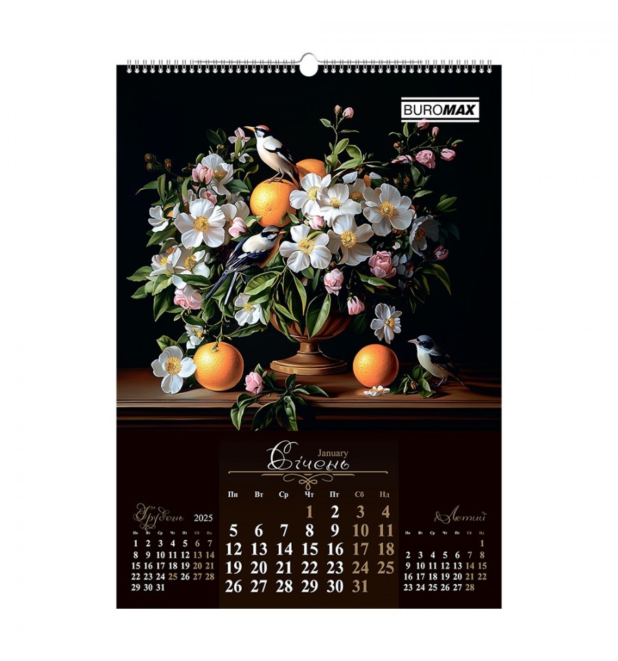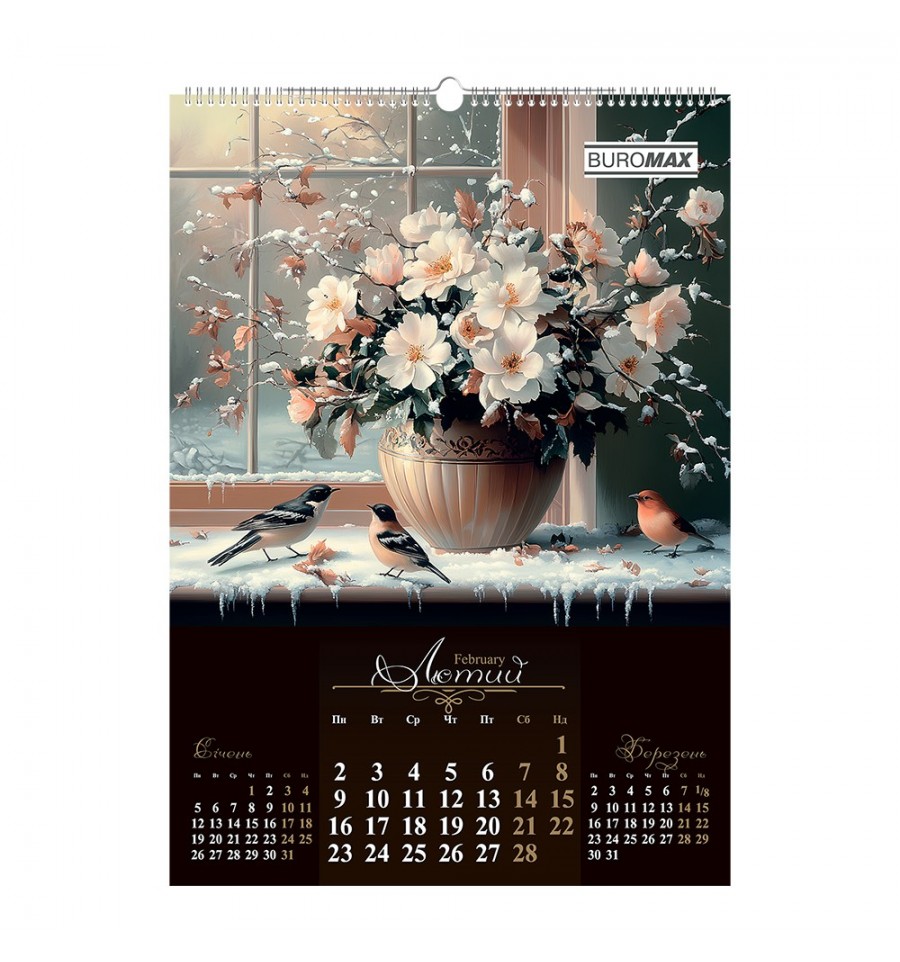 Настенный опрокидывающийся календарь от BUROMAX имеет дизайнерские постеры и будет служить прекрасным дополнением интерьера.Формат А2 (420х594 мм); Содержит 13 листов – уникальную дизайнерскую обложку и 12 листов блока с дизайнами; Картон плотностью 350 г/м² мелованная глянцевая, полноцветная односторонняя печать с защитным УФ лаком; Блок: бумага мелованная матовая плотностью 200 г/м², 12 листов; календарь на три месяца на одном листе (предыдущий, текущий, следующий); Крепление – серебряная пружина по узкой стороне, изгиб для подвеса; Ориентация – вертикальная; Индивидуальная упаковка: прозрачный п/е пакет