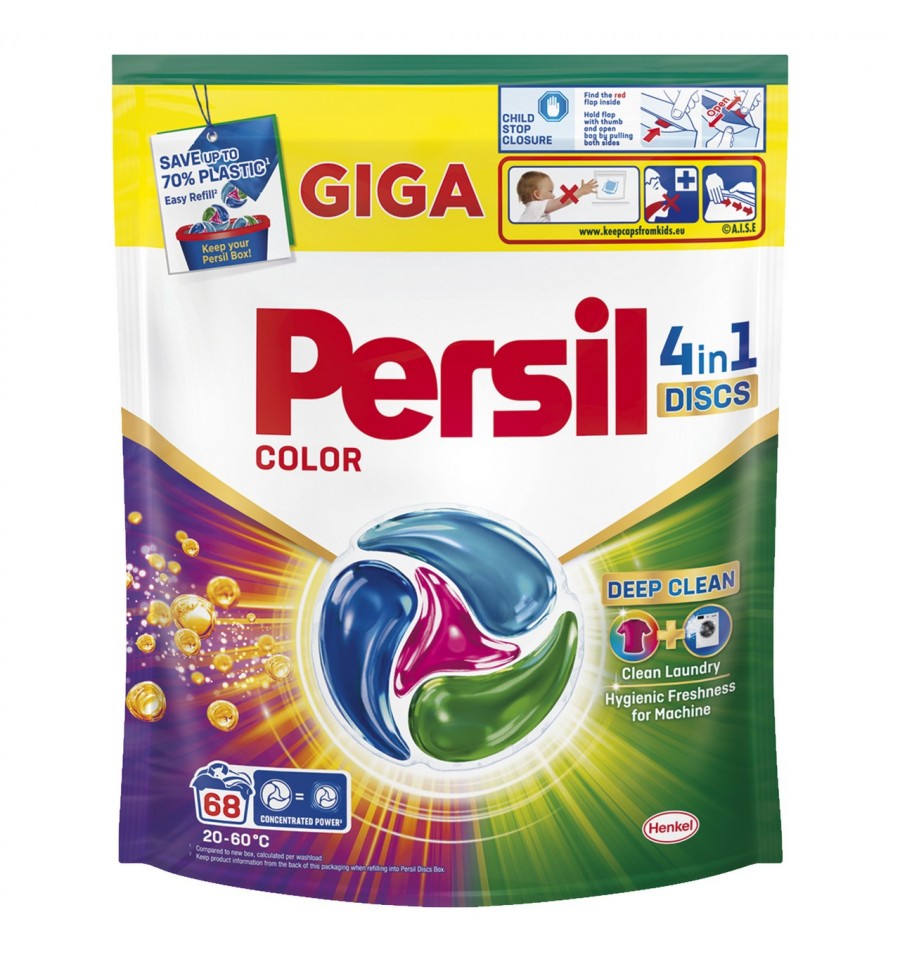 Диски Persil Цвет 68 циклов стирки. Persil Диски Deep Clean 4в1 для стирки цветных вещей – глубокая очистка и яркие цвета ваших вещей после каждого цикла стирки. Диски Persil удаляют даже самые глубокие пятна, не повреждая при этом ткань. Каждая из четырех камер в диске содержит мощную формулу, разработанную для работы в 4 ключевых направлениях: удаление пятен, обеспечение долговременной свежести, яркости одежды и ухода за тканью. А еще с обновленной формулой помогают вашей стиральной машине оставаться гигиенически чистой. Просто положите диск в барабан стиральной машины и получите все преимущества использования стиральных средств от Persil. Наши новые компактные стиральные капсулы Discs обеспечивают высокую эффективность чистки с уменьшенным количеством материалов, необходимых для производства, способствуя улучшению постоянства среды. Формула Persil помогает обеспечить эффективное удаление загрязнений, сохраняя при этом яркость одежды даже после нескольких циклов стирки. Диски Цвет используют для стирки цветных вещей. Шаг навстречу более чистой окружающей среде: Настойчиво борется с пятнами, бережно относится к планете. Эффективный при низких температурах, удаляет пятна уже от 20 ° C даже при полной загрузке стиральной машины. Преимущества продукта: - глубоко очищает белье, сохраняя цвета яркими. - помогает вашей стиральной машине оставаться гигиенически свежей. - Диски для стирки эффективны даже при полной загрузке белья. – Эффективно удаляют пятна в холодной воде от 20 °C. Положите один диск Persil в барабан стиральной машины, загрузите белье и приступите к стирке. Используйте один диск при среднем загрязнении и загрузке 4-5 кг (вода мягкая и средней жесткости). Для очень грязного белья или при загрузке более 4,5 кг используйте 2 диска. Препарат подходит для воды любой жесткости. Можно использовать при любой температуре от 20 до 60 °C. Подходит для всех типов тканей. Для изделий из шерсти и шелка рекомендуем использовать специальные моющие средства. Следуйте рекомендациям на ярлыках одежды и паспорте стиральной машины при выборе режима стирки и температуры. Белое белье стирайте отдельно от цветного. Хранить, защищая от прямых солнечных лучей, при температуре не выше 35 °C и относительной влажности воздуха не более 95%. Эффективен при температуре от 20 °C до 95 °C. Держите упаковку закрытой после использования. Оболочка (пленка) диска на 100% растворяется в воде. Не сжимайте, не кусайте и не надрезайте. капсулы. Коснитесь только сухими руками, чтобы избежать риска протекания. Состав: 15 - 30 % анионные ПАВ, неионогенные ПАВ; 5 – 15 % мыло; < 5% фосфонаты; См. также: энзимы, ароматизаторы, гексил ценнамаль, линалоол. Срок годности: 540 дней. Хранить, защищая от прямых солнечных лучей, при температуре не выше 35 °C и относительной влажности воздуха не более 95%. Производитель: "Хенкель Сербия д.о.о." Поставщик: Общество с ограниченной ответственностью "Хенкель-Украина". Адрес производителя: "Хенкель Сербия д.о.о.", Булевар Ослобождения 383, 11000 Белград, Сербия. Страна: Сербия. Масса нетто: 1.122 кг.