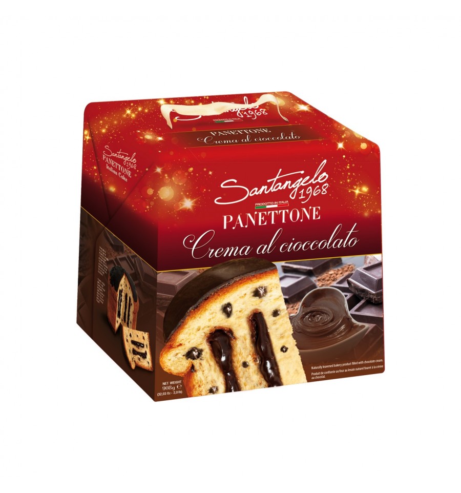 Кекс панеттоне (panettone) с начинкой из шоколадного крема. Хлебобулочное изделие на натуральной закваске с начинкой из шоколадного крема и покрытое какао-глазурью. Состав: мука ПШЕНИЧНАЯ, растительный маргарин (растительный жир: пальмовое масло; вода, растительное масло: подсолнечное; соль пищевая, ароматизаторы), начинка шоколадная (11,2%) (глюкозный сироп, сахар, вода, жир растительный: пальмовый; шоколад (0,9%) от шоколада (0,9%) какао-масло), МОЛОКО сухое обезжиренное, паста из ЛЕСНЫХ ГОРЕХОВ, крахмал кукурузный модифицированный, загуститель: пектин; сахар, закваска (мука ПШЕНИЧНАЯ, вода), вода, ЯЙЦА, ЯИЧНЫЙ желток, какао-капли (4,5%) (сахар, растительный пальмовый жир, какао-порошок обезжиренный, эмульгатор: СОЕВЫЙ лецитин; ароматизаторы); МОЛОКО сухое обезжиренное, мука ПШЕНИЧНАЯ солодовая, соль поваренная (с МОЛОКА), ароматизаторы. Может содержать другие ГОРЕХИ и ГОРЧИЦУ. из них сахара 25 г. Белки 6,5 г. Соль 0,35 г. На упаковке изображен пример сервировки. Групп срл, Виа Натта, 22 – 05100 Терни, Италия. 908 г.