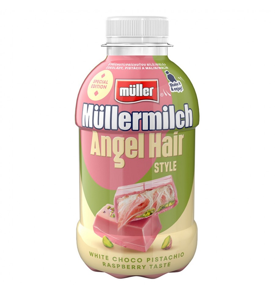 Молочный ароматизированный напиток Müllermilch «Ангельские волосы», 3,6% 400 г. Продукт термизирован. Содержание молочного жира не менее 3,6%. Хранить в холодильнике. Дата «Лучше потребить до» и номер партии указаны на упаковке. Хранить при температуре воздуха от +1°С до +8°С. Состав: цельное МОЛОКО, ПХТА, сахар, 1% белый шоколад (содержит МОЛОКО), 0,1% пюре из ФИСТАШОК, модифицированный крахмал, загуститель: ксантан; стабилизатор: каррагенан; краситель: кармины; ароматизатор, тиамин, рибофлавин, витамин B6, витамин B12. Может содержать следы других орехов. Питательная ценность на 100 мл (ml) продукта: жиры – 3,6 г (g), из которых насыщены – 2,4 г (g), углеводы – 10,5 г (g), из которых сахара – 10,2 г (g), белки – 3,3 г (g), соль – 0,14 г (g), соль – 0,14 г (g) (21%*), Рибофлавин – 0,35 мг (mg) (25%*), Витамин В6 – 0,28 мг (mg) (20%*), Витамин В12 – 0,50 мкг (μg) (20%*). Энергетическая ценность: 367 кДж(kJ)/88 ккал(kcal). Производитель: Molkerei Alois Müller GmbH & Co. KG Zollerstraße 7, D-86850 Aretsried, Германия. Тел.: +49 8236 9990. Импортер: ООО «АКФОРТ», 49000, Украина, г. Днепр, ул. Краснопольская, 13Ж, офис 43, тел.+380675600486. Претензии от потребителей принимает импортер. Масса нетто: 400 г. Объем: 383 мл.