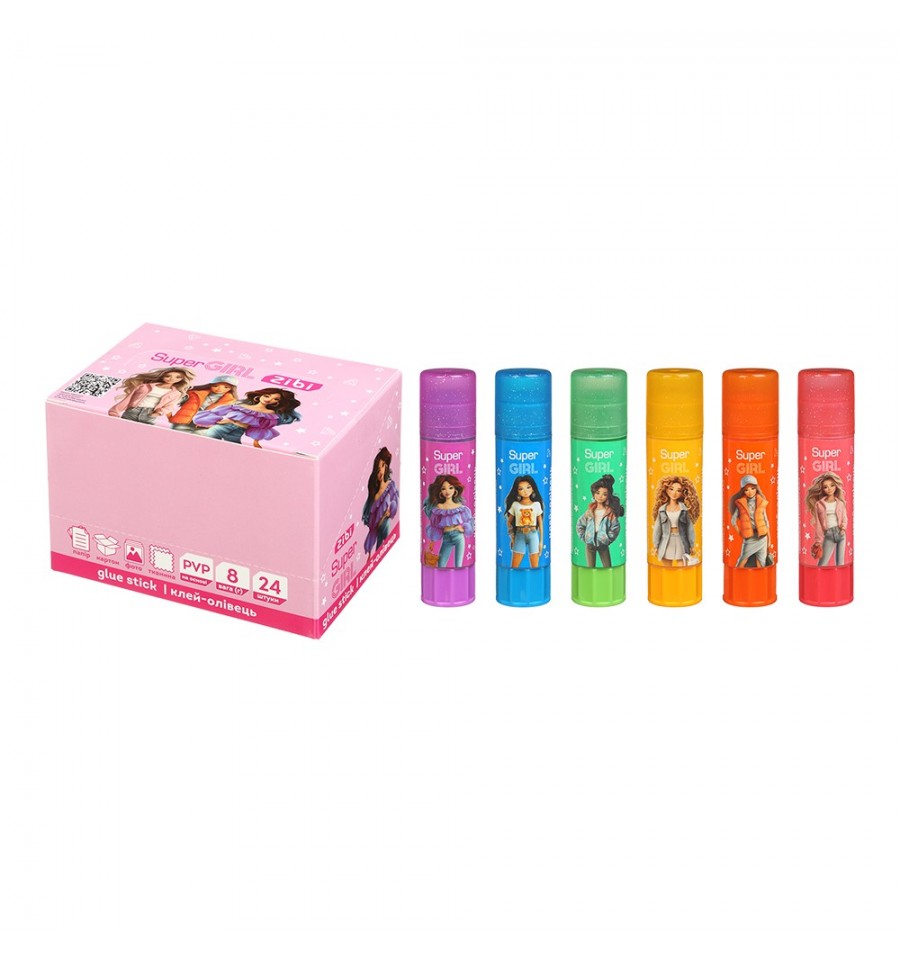 Клей-карандаш серии Super Girl от ZiBi – предназначен для склеивания бумаги, картона, фотографий, ткани. Подходит для повседневного использования в школе, садике, на кружках, мастер-классах и домах для творчества, декора, аппликации. Может использоваться школьниками, питомцами дошкольных учреждений, участниками кружков и творческих студий, а также другими потребителями для бытового и образовательного использования.• имеет привлекательный яркий дизайн корпуса • колпачок предотвращает высыхание клея. • цвет клея – полупрозрачный цветной с блестками, в цветах ассорти. • при нанесении оставляет легкий едва заметный след-индикатор. • ароматизированный, каждый цвет имеет свой приятный аромат • сохраняет клеящее свойство при низкой температуре • легко смывается водой • не содержит растворителей • цвет тюбика ассорти: розовый, оранжевый, зеленый, фиолетовый, желтый, синийТехнические характеристики: • тип – карандаш • масса – 8 г • цвет – цветной ассорти • размер тюбика – 81х20 ммСостав: PVP (поливинилпирролидон)