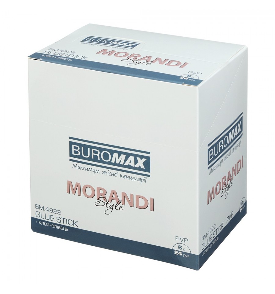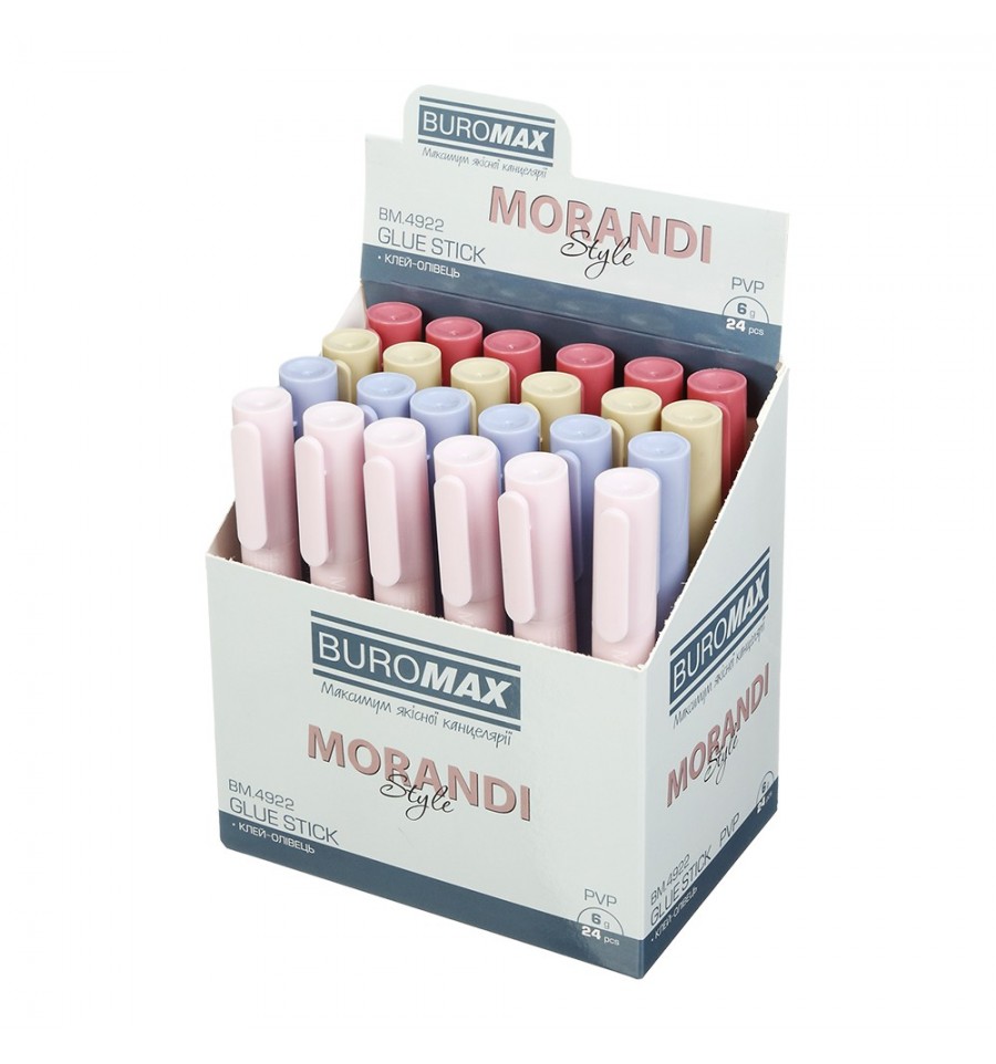 Клей-карандаш серии MORANDI STYLE от BUROMAX – подходит для повседневного использования в офисе, на рецепции, для творчества, декора, аппликации. Благодаря оригинальному корпусу в форме ручки в стильном популярном цвете палитры Моранди такой клей станет отличным дополнением к модной эстетической коллекции канцтоваров от BUROMAX.масса 6 г для склеивания бумаги, картона, фотографий, ткани (не деформирующей поверхности) колпачок с клипом, предотвращает высыхание клея на основе PVР (поливинилпирролидон) цвет клея: цветной ассорти (розовый, синий, желтый) при нанесении оставляет цветной след не содержит растворителей без резкого запаха сохраняет клеящее свойство при низкой температуре легко смывается водой размер тюбика 138х16 мм тюбик из глянцевого пластика круглой формы в цветах ассорти: капучино, маренго, оливковое, пудровое. упаковка: картонный шоу-бокс содержит 24 шт. в цветах ассорти