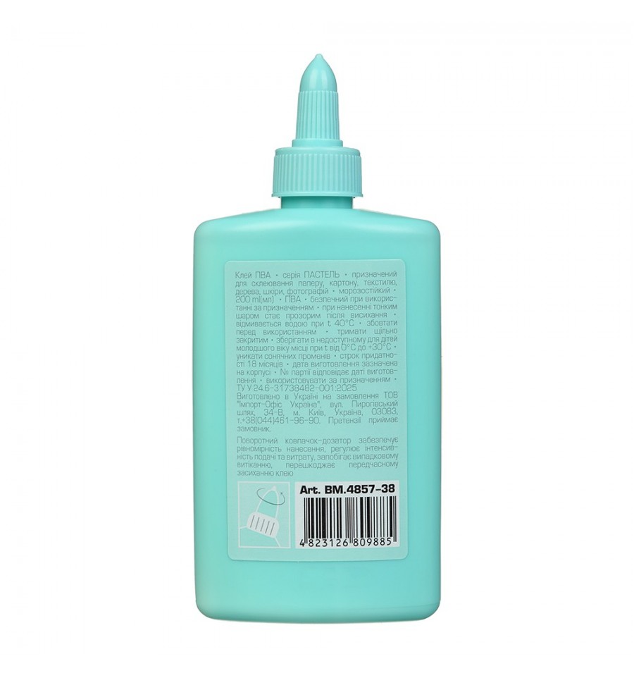 Клей ПВА серии PASTEL от BUROMAX – станет незаменимым помощником в работе. Подходит для повседневного использования в офисе, дома, а также для творчества. Пластиковая бутылка изготовлена в нежном пастельном цвете, совместимом с другими канцелярскими товарами серии PASTEL, позволяет создать рабочую зону в любимой цветовой гамме. объем – 200 мл имеет классическое основание ПВА (поливинилацетат), клей белого цвета. обладает высокой адгезией и очень хорошими клеевыми свойствами. для склеивания бумаги, картона, фотографий, дерева, ткани, пробки морозостойкий (до 6 циклов замораживания-размораживания сохраняет свои свойства) пластиковый флакон с дозатором, который выкручивается колпачок-дозатор регулирует подачу клея и предотвращает высыхание. клей наносится как тонкой линией так и каплями. в горизонтальном положении не вытекает смывается водой цвет флакона – мятный
