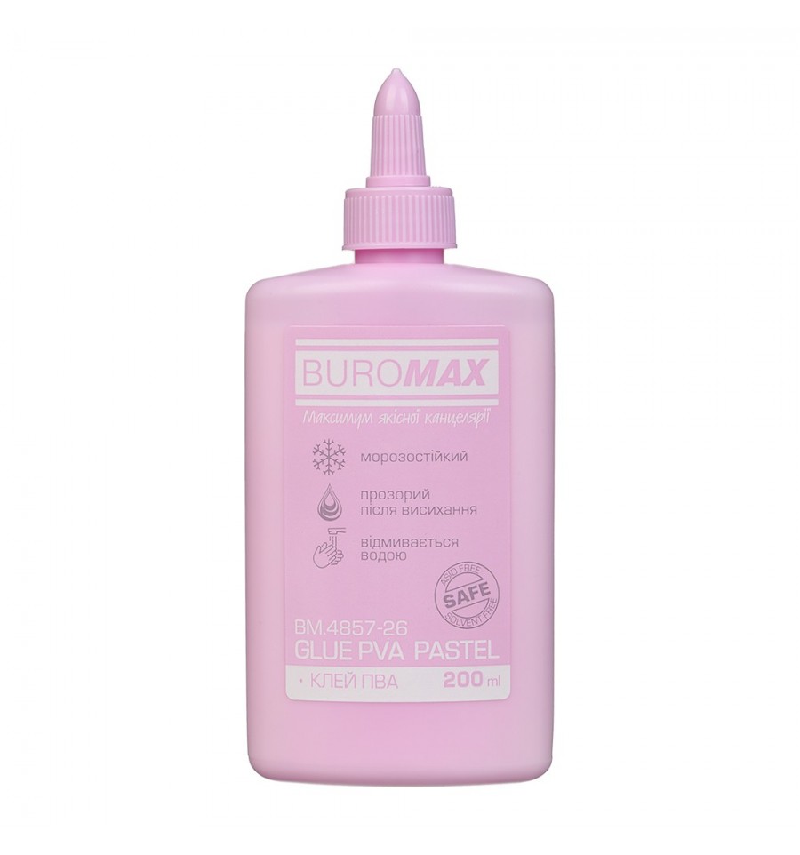 Клей ПВА серии PASTEL от BUROMAX – станет незаменимым помощником в работе. Подходит для повседневного использования в офисе, дома, а также для творчества. Пластиковая бутылка изготовлена в нежном пастельном цвете, совместимом с другими канцелярскими товарами серии PASTEL, позволяет создать рабочую зону в любимой цветовой гамме. объем – 200 мл имеет классическое основание ПВА (поливинилацетат), клей белого цвета. обладает высокой адгезией и очень хорошими клеевыми свойствами. для склеивания бумаги, картона, фотографий, дерева, ткани, пробки морозостойкий (до 6 циклов замораживания-размораживания сохраняет свои свойства) пластиковый флакон с дозатором, который выкручивается колпачок-дозатор регулирует подачу клея и предотвращает высыхание. клей наносится как тонкой линией так и каплями. в горизонтальном положении не вытекает смывается водой цвет флакона – сиреневый