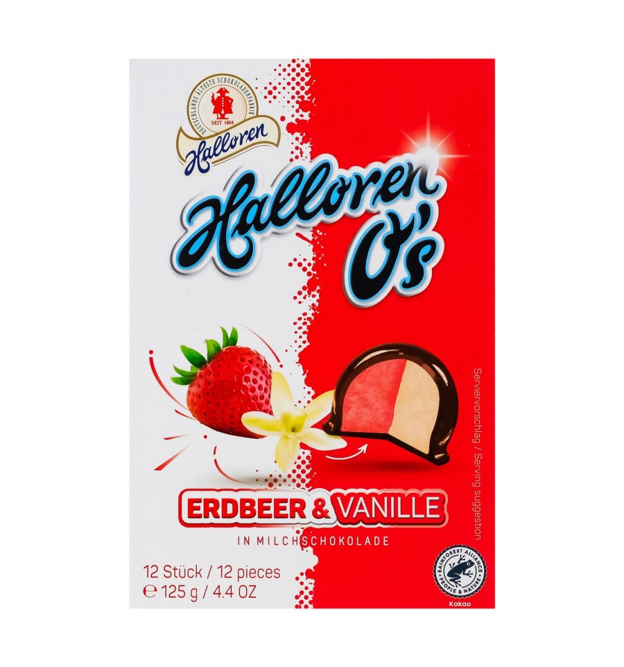 Halloren O's Strawberry-Vanilla, 12230. Конфеты «Halloren O's Strawberry-Vanilla». с начинкой пралине и клубнично-ванильным кремом в молочном шоколаде 25%. Состав: сахар, сухое цельное МОЛОКО, сироп глюкозный, какао-масло, вода, масло сливочное (с МОЛОКА), какао тертое, порошок клубники 1%, сыворотка молочная сухая (с МОЛОКА), влагоудерживающий агент: инвертаза, ароматизатор натуральный: ваниль, ванили, регулятор кислотности: лимонная кислота, краситель: кармин, ароматизатор натуральный: клубника. Минимальное содержание какао-продуктов в молочном шоколаде 33%. ПРОДУКТ МОЖЕТ СОДЕРЖАТЬ СЛЕДЫ ГОРЕХОВ, АРАХИСА, СОИ, ЯИЦ, ГЛЮТЕНА. Питательная ценность на 100 g(г) продукта: Энергетическая ценность 1806 kJ(кДж)/429 kcal(ккал). Жиры 13,0g(г). из них насыщены 8,8g(г). Углеводы 75,0 g(г). из них сахара 70,0 g(г). Белки 3,8г(г). Соль 0,10 г(г). Хранить в сухом прохладном месте. Лучше употребить в: указанные на боковой части упаковки. Страна происхождения Германия. Производитель: Халорен Шоколаденфабрик АГ, Деличер Штрасе 70, 06112 Хале (Заале), Германия. Импортер: ООО "Метро Кэш энд Кери Украина", 02140, Украина, г. Киев, Проспект П. Григоренко, дом. 43. По вопросам продукта обращайтесь по тел. горячей линии импортера 0800501401 (бесплатно в пределах Украины). Масса нетто: 125 г.