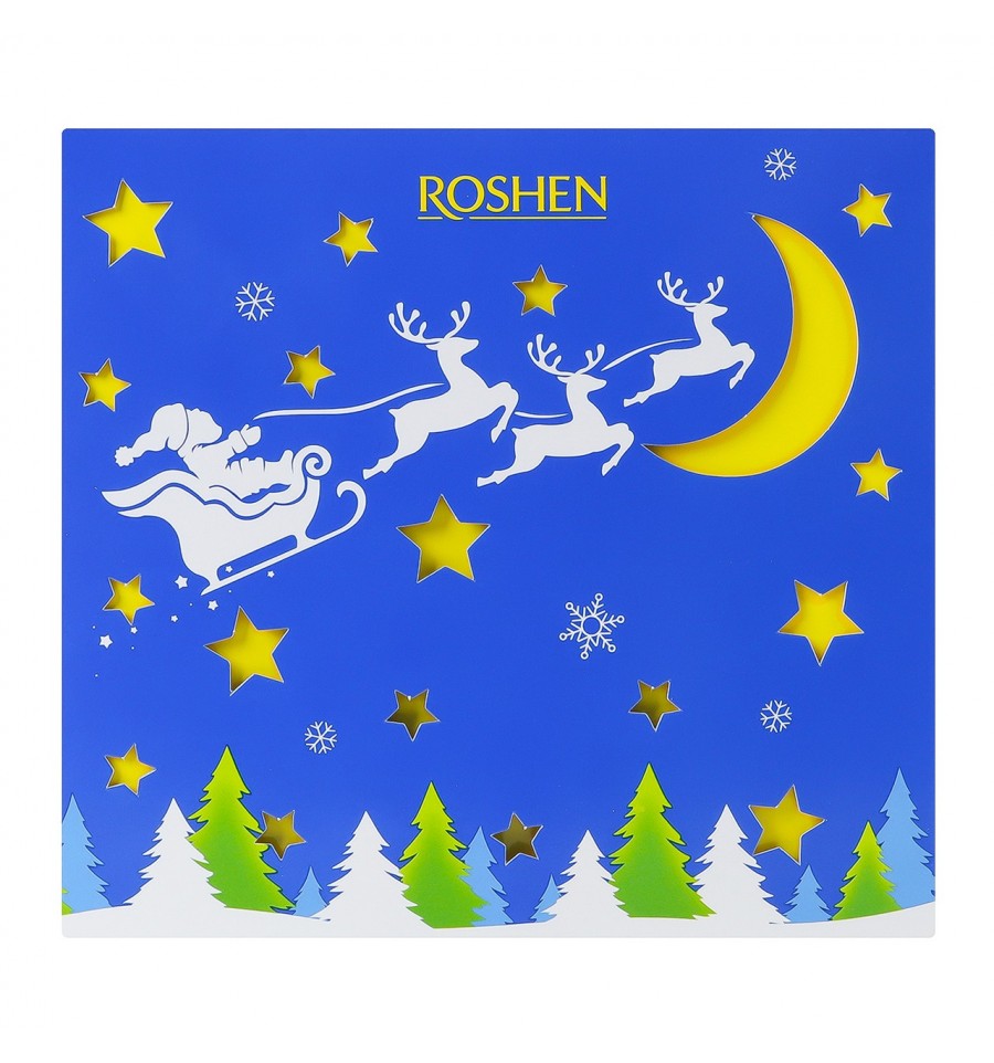 Набор подарочных Рошен Рождественское небо 509г. Состав: сахар, патока, масла растительные (полностью гидрогенизированная пальмоядровая, неподрогенизированная пальмовая, негидрогенизированная подсолнечная, негидрогенизированная кокосовая, неподрогенизированная ши, негидрогенизированная пальмоядровая), ядра бобов арахису (молоко обезжиренное сгущенное, сахар, негидрогенизированное пальмовое масло, лактоза), молоко сухое цельное, какао тертое, глюкозно-фруктовый сироп, какао-масло, влагоудерживающий агент сорбитовый сироп, молоко сухое обезжиренное, желатин, какао сухой (из молока), регуляторы кислотности (кислота молочная, кислота лимонная, Е325, Е331), сок яблочный концентрированный, ядра орехов фундука жареные, сливки молочные сухие, эмульгаторы (лецитины (содержит сою), Е471, Е472c, Е4куш кукурузное, сахар, соль), желирующий агент каррагинан, соль, ароматизаторы, белок яичный сухой, глюкоза, бренди, красители (Е100, Е132, Е150d (содержит сульфиты), Е160а, Е160c (гидронат, карбона) сок апельсиновый концентрированный, сок вишневый концентрированный, крахмал, спирт, глазурирующий Е901, йогурт (из молока), крахмал модифицированный, ядра миндаля жареные, консервант Е202. Энергетическая ценность продукта: 1912кДж/10к продукта: белки - 5.4г/100г, жиры - 17.6г/100г, насыщенные жиры - 9.5г/100г, углеводы - 68.1г/100г, из них сахара - 53.2г/100г, соль - 0.27г/10 (+/-3)ºC и относительной влажности воздуха не более 75% Срок годности: 1 год.