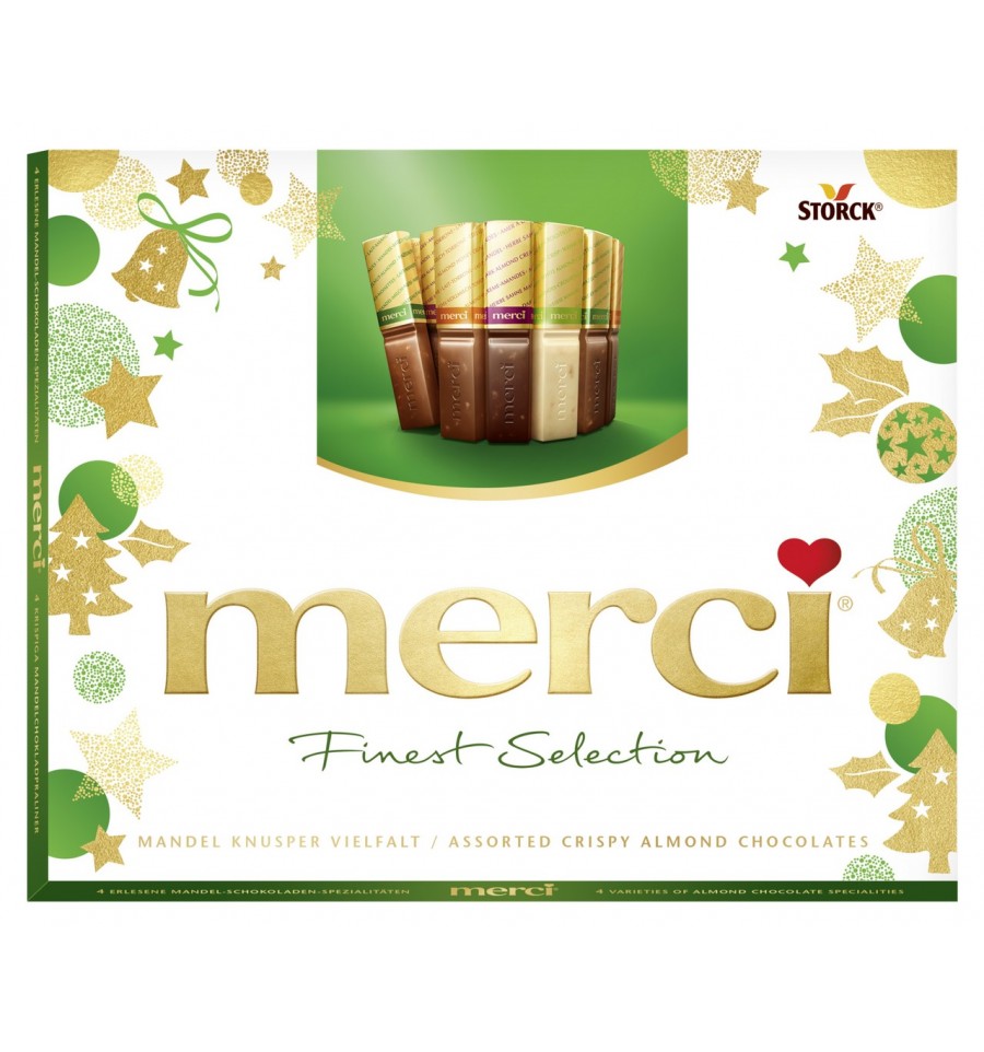 Конфеты Merci шоколадные 4 вида с миндалем 250г. Состав: конфеты молочный шоколад с лесным орехом и миндалем: сахар, молоко сухое цельное, какао-масло, измельченный лесной орех, какао тертое, измельченный миндаль, маслянка молочная сухая (сывороточный продукт), лактоза, эмульгатор соевый лецитин, экстракт конфеты белый шоколад с хрустящим миндалем: сахар, какао-масло, молоко сухое цельное, измельченный миндаль, сливки сухие, подсырная сухая молочная сыворотка, лактоза, рисовая мука, маслянка молочная сухая (сывороточный продукт), пшеничный белок, эмульга солод, пальмовое масло, экстракт ванили; конфеты молочный шоколад с миндалем и медовой нугой: сахар, молоко сухое цельное, какао-масло, какао тертое, масленка молочная сухая (сывороточный продукт), лактоза, миндаль, сироп глюкозы, мед, масло кокосовое рафинированное, эмульгатор - соевый белок, крахмал картофельный, ароматизатор натуральный, экстракт ванили; конфеты темный шоколад с миндалем: сахар, какао тертое, измельченный миндаль, какао-масло, сливки сухие, молоко сухое цельное, эмульгатор – соевый лецитин, экстракт ванили. Калорийность в 100г продукта: 568 ккал. Пищевая (питательная) ценность в 100г продукта: Белки – 9.6г., жиры – 37.2г., углеводы – 46.8г. Условия хранения: хранить при температуре от 13°C до 21°C - 9 месяцев, при относительной влажности воздуха не более 65% Хранить в сухом, прохладном месте. Производитель: Аугуст Шторк Кг. Страна производства: Германия. Импортеры: ООО Аскания Дистрибьюшн; ООО Надлер; ООО Атрия Импро. Содержимое ГМО: Не содержит указанного вещества. Масса нетто: 250 г