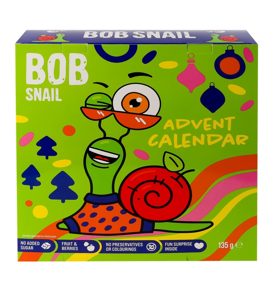 Набор конфет Bob Snail Адвент-календарь с игрушками 97г. Состав: натуральная фруктовая конфета Яблоко: яблоко 100%; натуральная фруктовая конфета Яблоко-груша: яблоко 70%, груша 30%; натуральная фруктовая конфета Манго: манго 100%; натуральная фруктово-ягодная конфета Яблоко-клубника: яблоко 80%, клубника 20%; натуральная фруктово-ягодная конфета Яблоко-малина: яблоко 80%, малина 20%; натуральная фруктово-ягодная конфета Яблоко-черная смородина: яблоко 80%; черная смородина 20%; натуральная фруктово-ягодная конфета Яблоко-вишня: яблоко 80%, вишня 20%; мармелад Яблоко-вишня: яблочный сок концентрированный 83.3%, сок вишневый концентрированный 13.8%, агар 2.9%; мармелад Яблоко-груша-лимон: яблочный сок концентрированный 78.2%, сок грушевый концентрированный 18.4%, агар 2.9%, сок лимонный концентрированный 0.5%; мармелад Яблоко-манго-тыква-чиа: яблочный сок концентрированный 80.5%, манговое пюре 8.2%, тыквенное пюре 8.2%, агар 2.3%, зерна чиа 0.8%; коллекционная игрушка: пластик (ПВХ); магнит: резиновый магнит и пластик (ПВХ). Без ГМО. Энергетическая ценность продукта: 1195/1203/1061/1186/1184/1238/1214/1286/1154/1183кДж/100г, 283/285/251/281/281/294/287/3. Питательная (пищевая) ценность продукта: белки - 1.5/1.8/2.5/2.5/3.2/3.1/2.4/1.3/1.4/1.4г/100г, жиры - 2/1.8/2.1/2.3/2.1/1.9/1.8/0/0/0 0.3/0.3/0.4/0.3/0.3/0.3/0.2/0/0/0.1г/100г, углеводы - 59/59/52/56/54/57/61/74/65/66г/100г, из них сахара - 54/52/52/52/50/52/55/69/61/63г/100г, соль - 0.04/0.03/0.05/0.04/0.03/0.04/0.04/0.02/0/0г/100г. Условия хранения: хранить при температуре +2..+25ºC и относительной влажности воздуха не более 75%. Меры предосторожности: внутри игрушка. Рекомендуется наблюдение взрослого лица. Игрушка не предназначена для детей младше 3-х лет. Дети случайно могут проглотить или вдохнуть детали. Предназначена для детей от 3-х лет. Срок годности: 1 год. Срок годности после открытия продукта: 3 дня. Страна изготовитель: Украина. Производитель и адрес производителя: ООО "Эко-Снек", ул. Новая, 2А, с. Агрономическое, Винницкий р-н, Винницкая обл., Украина, 23227. Импортер и адрес импортера: ООО "Эко-Снек", ул. Новая, 2А, с. Агрономическое, Винницкий р-н, Винницкая обл., Украина, 23227. Количество: 24шт. Масса нетто: 97г.