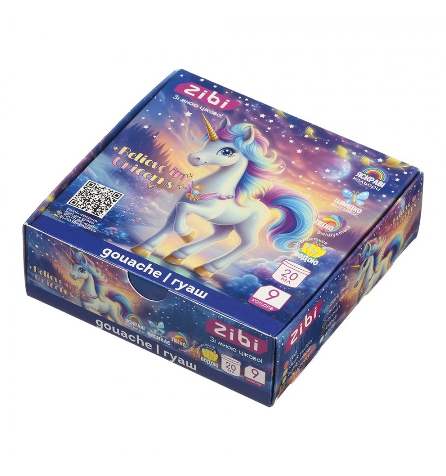 Гуашь серии UNICORN от ZiBi – это краски для рисования на бумаге, картоне и дереве. Набор гуашевых красок можно использовать для занятий в саду, школе, художественных студиях и кружках. Рисование такими красками отлично развивает мелкую моторику, фантазию и творческий потенциал у детей.9 чистых насыщенных цветов объем краски одного цвета в баночке 20 мл классический рецепт непрозрачные, перекрывающие предыдущие слои имеют хорошую покровную способность и насыщенный однородный цвет после нанесения. быстро высыхают, приобретая матовую поверхность цвета смещаются между собой, образуя новые оттенки восстанавливаются методом перемешивания и добавлением воды упаковка: коробка из плотного ламинированного картона