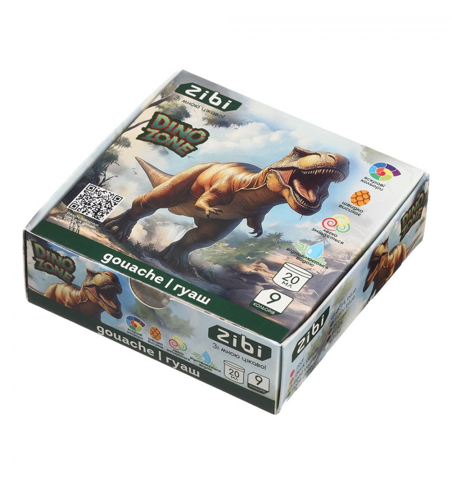 Гуашь серии DINO от ZiBi – это краски для рисования на бумаге, картоне и дереве. Набор гуашевых красок можно использовать для занятий в саду, школе, художественных студиях и кружках. Рисование такими красками отлично развивает мелкую моторику, фантазию и творческий потенциал у детей.9 чистых насыщенных цветов объем краски одного цвета в баночке 20 мл классический рецепт непрозрачные, перекрывающие предыдущие слои имеют хорошую покровную способность и насыщенный однородный цвет после нанесения. быстро высыхают, приобретая матовую поверхность цвета смещаются между собой, образуя новые оттенки восстанавливаются методом перемешивания и добавлением воды упаковка: коробка из плотного ламинированного картона