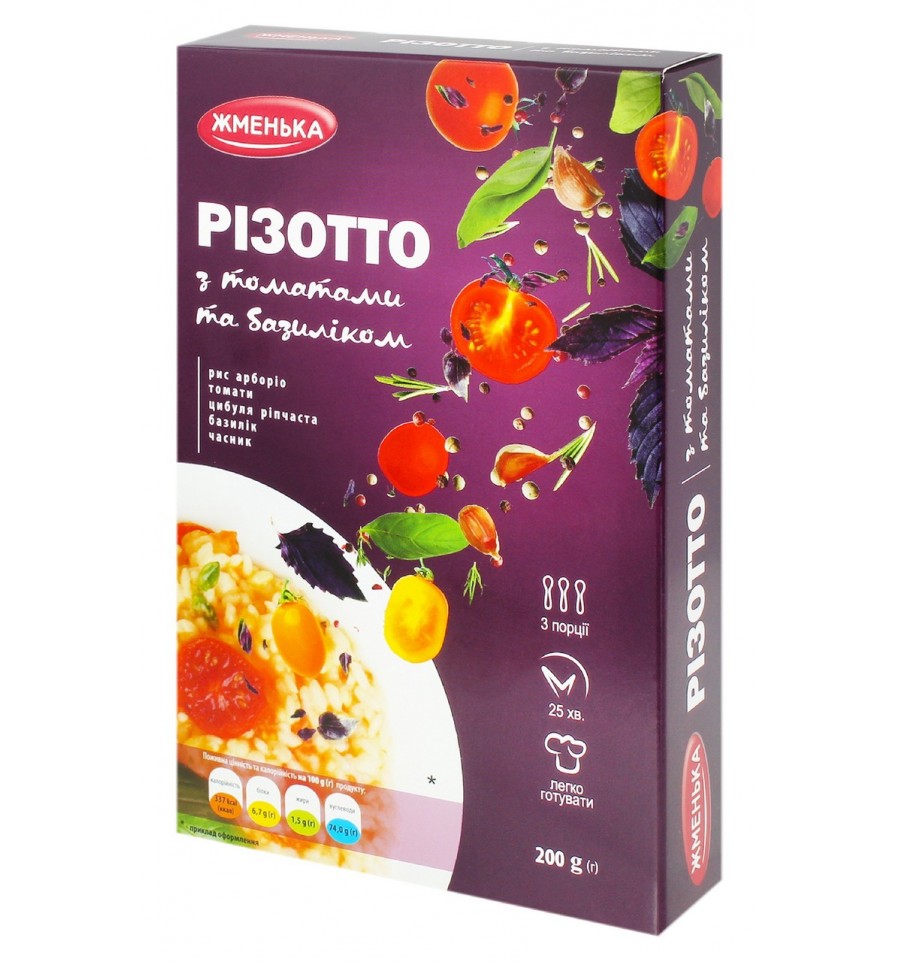 Ризотто с помидорами и базиликом из риса сорта арборио для приготовления итальянского блюда. Состав: рис арборио 91%, томаты сушеные 3%, овощи сушеные 5% (лук репчатый, чеснок), базилик сушеный 1%. Калорийность (энергетическая ценность) в 100г продукта: 337 ккал (1410 кДж). Пищевая (питательная) ценность в 100г продукта: Белки – 6.7г., жиры – 1.5г., углеводы – 74г. Условия хранения: хранить при температуре от 0°C до 20°C – 1 год. Хранить в сухом месте. Производитель: ООО ФАБРИКА БАКАЛЕЙНЫХ ПРОДУКТОВ. Страна производства: Украина. Адрес производственных мощностей: город Сквира, Белоцерковский район, Киевская область, 09000, Украина. Содержимое ГМО: Не содержит указанного вещества. Масса нетто: 200г. 1. Поставить емкость с толстым дном на плиту, налить 3 ст.л растительного масла, всыпать содержимое пакета и нагревать смесь несколько минут, помешивая, чтобы овощи не подгорели; 2. Добавить 60-80 мл белого сухого вина и помешивая дать ему испариться; 3. Взять 600-700 мл воды или бульона, влить в смесь часть (300-350 мл), добавить соль, перец по вкусу, перемешать и довести до кипения; 4. По мере впитывания жидкости постепенно добавлять вторую часть воды или бульона, помешивая. Готовить 20-25 минут на слабом огне; 5. Снять с огня, добавить сливочное масло, дать настояться 5 мин. Перед подачей на стол добавить натертый сыр Пармезан по вкусу.