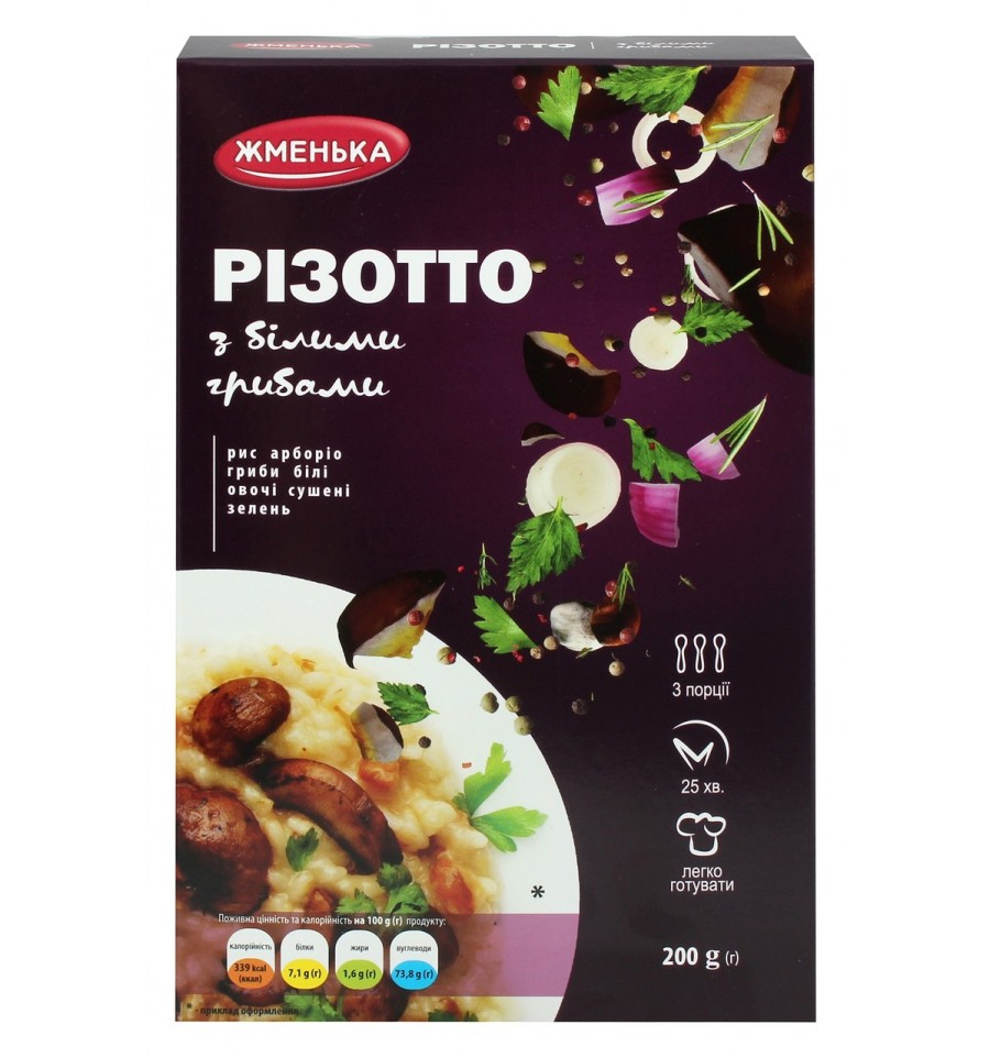 Концентрат Горстка Ризотто с белыми грибами сухой 200г. Состав: рис арборио (ризотто) 91.85%, овощи сушеные 5% (лук репчатый, чеснок), грибы сушеные белые 2.4%, зелень петрушки сушеная. Калорийность "На 100г продукта: 1418кДж/339ккал". Питательная ценность на 100г продукта: белки – 7.1г, жиры – 1.6г, углеводы – 73.8г. Условия хранения: в сухих хорошо вентилируемых помещениях, с относительной влажностью воздуха не более 75%, при температуре не выше +20°C - 12 месяцев. Не допускается совместное хранение с быстро портящимися продуктами или имеющими специфический резкий запах. Страна изготовитель: Украина. Производитель: ООО Фабрика бакалейных продуктов, ул. Железнодорожная 8, г. Сквира, Сквирский р-н, Киевская обл., Украина, 09000. Вес нетто: 200г