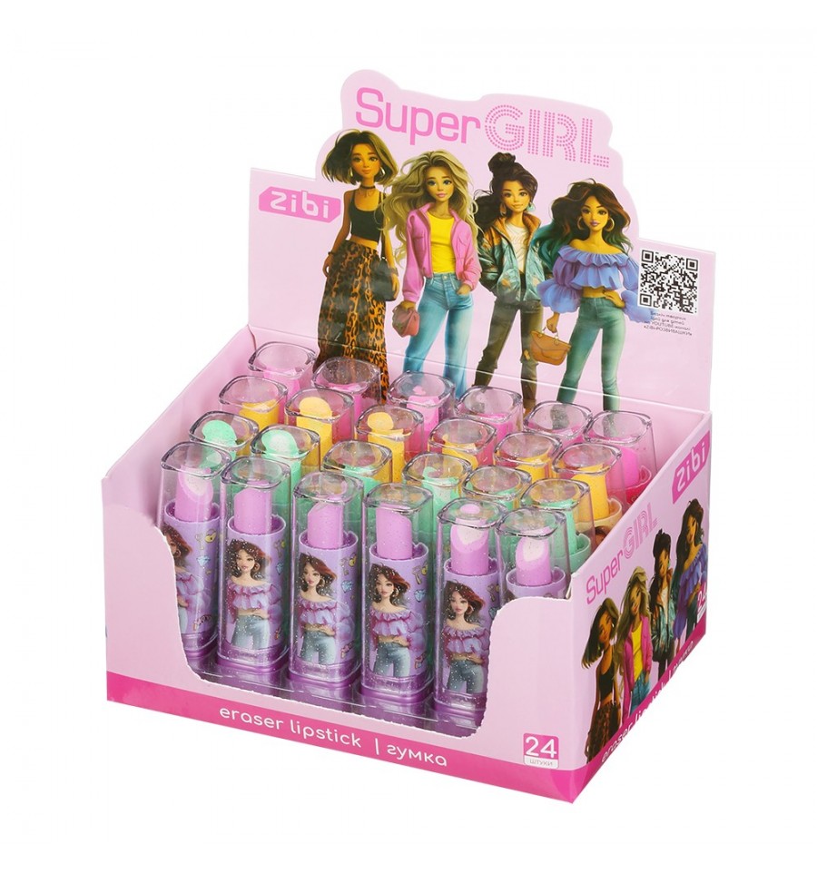 Резинка "Помада" серии SUPER GIRL от ZiВi – предназначена для удаления надписей графитовых карандашей, является не только инструментом для истирания, но и оригинальным стильным аксессуаром. Подходит для использования в учебе, работе и творчестве, станет отличным украшением рабочей зоны благодаря своему интересному дизайну. Небольшой размер резинки позволит уложить ее в пенал или органайзер.Резинка умещена в пластиковый тюбик с крышечкой и механизмом выкручивания – выглядит как настоящая помада! Благодаря корпусу Ваша резинка никогда не запачкается, дольше будет мягкой и эластичной!Размер резинки с тюбиком: 75х20х20 мм. Материал резинки: синтетический каучук Цвет резинки ассорти: розовый, фиолетовый, зеленый, желтый Рассчитана на стирание надписей графитовых карандашей твердостью 2Н-НВ-2В. Индивидуальная упаковка: пластиковый тюбик в форме помады Групповая упаковка: картонный шоу-бокс содержит 24 резинки в 4 дизайнах ассорти.