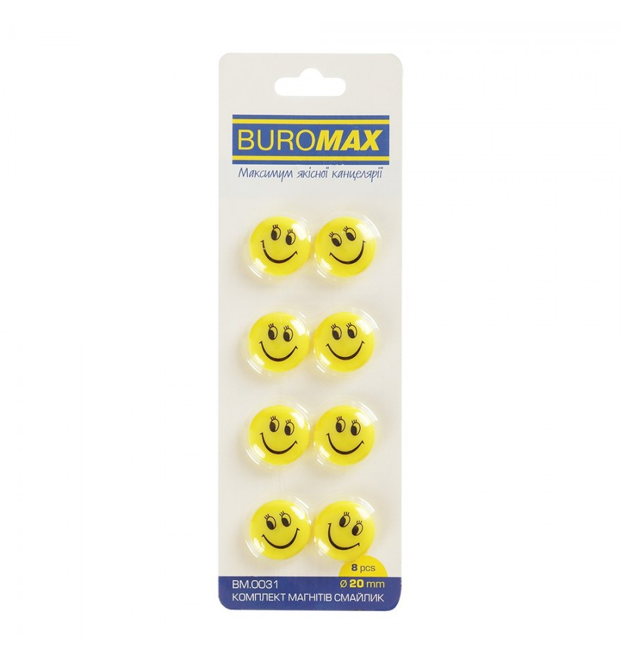 Комплект магнитных держателей СМАЙЛИК от BUROMAX – для фиксации документов, заметок, зарисовок, плакатов, планов, графиков и других пособий на магнитно-маркерных досках и флипчартах, а также в быту, для декоративного оформления, на обычном холодильнике. Может использоваться офисными работниками, докладчиками, студентами, образовательными учреждениями, домашними пользователями.• надежный, сильный магнит • покрытие – прочный ударопрочный пластик • устойчивы к механическим повреждениям и ультрафиолету – не царапаются, не выгораютТехнические характеристики • количество в наборе – 8 шт. • диаметр – 20 мм • форма – круглая • цвет – желтыйСостав магнит, пластиковое покрытие