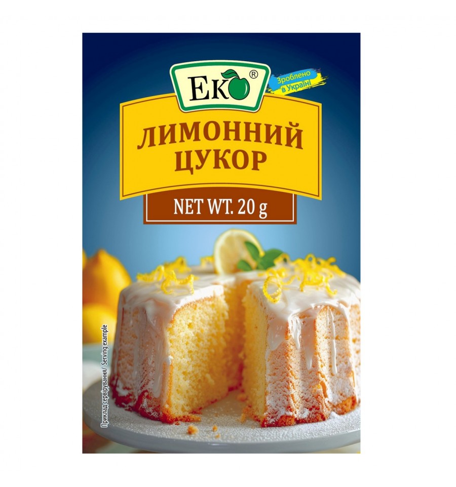 Сахар Эко лимонный 20г. Лимонный сахар. Сухая приправа к блюдам. Отличный аромат для выпечки и десертов. Предлагаем приготовить: Душистый лимонный кекс. Для теста понадобится: 250g муки, 1 ст.л. разрыхлителя ТМ "Эко", 0.5 ч.л. соли, 100 g сливочного масла, 150 g сахара, 2 яйца, 125 g сметаны жирностью 20%, 1 пакетик лимонного сахара. Мягкое масло, сахар, яйца, сметану, взбить до однородной массы. К просеянной муке добавить разрыхлитель и соль. Смешать тесто. Форму для кекса смазать сливочным маслом. Вылить тесто и поставить выпекать в разогретую до 180 С духовку на 40-50 минут. Состав: сахар, сушеная цедра лимона, эфирное масло лимона, лимонный порошок (концентрат лимонного сока, мальтодекстрин). Может содержать следы глютена, горчицы, сои, сельдерея, яичных и молочных продуктов. Энергетическая ценность на 100г продукта: 330 ккал / 1390 кДж, жиры - 0,0 г, насыщенные жиры - 0,0 г, углеводы - 87,0 г, сахара - 86,0 г, белки - 0,1 г, соль - 0,0 г. срок при. Хранить в чистых, сухих, хорошо вентилируемых помещениях, не зараженных вредителями хлебных запасов с относительной влажностью воздуха не более 75% при температуре не выше 25°С. Производитель: ЧАО «Экотехника». Адрес мощностей (объекта) производства: ул. Героев Днепра, 50а, с. Балико-Щучинка, Обуховский р-н, Киевская область, 09234, Украина. Тел.: +380(50) 463-95-13. www.eko.ua. Страна: Украина. Масса нетто: 20 г (допустимое отрицательное отклонение от массы нетто – 9%).